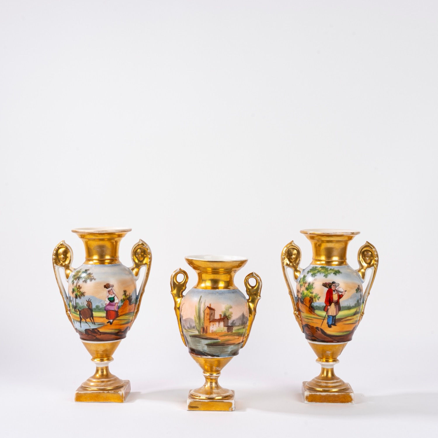 Lotto composto da tre vasi in porcellana policroma e oro