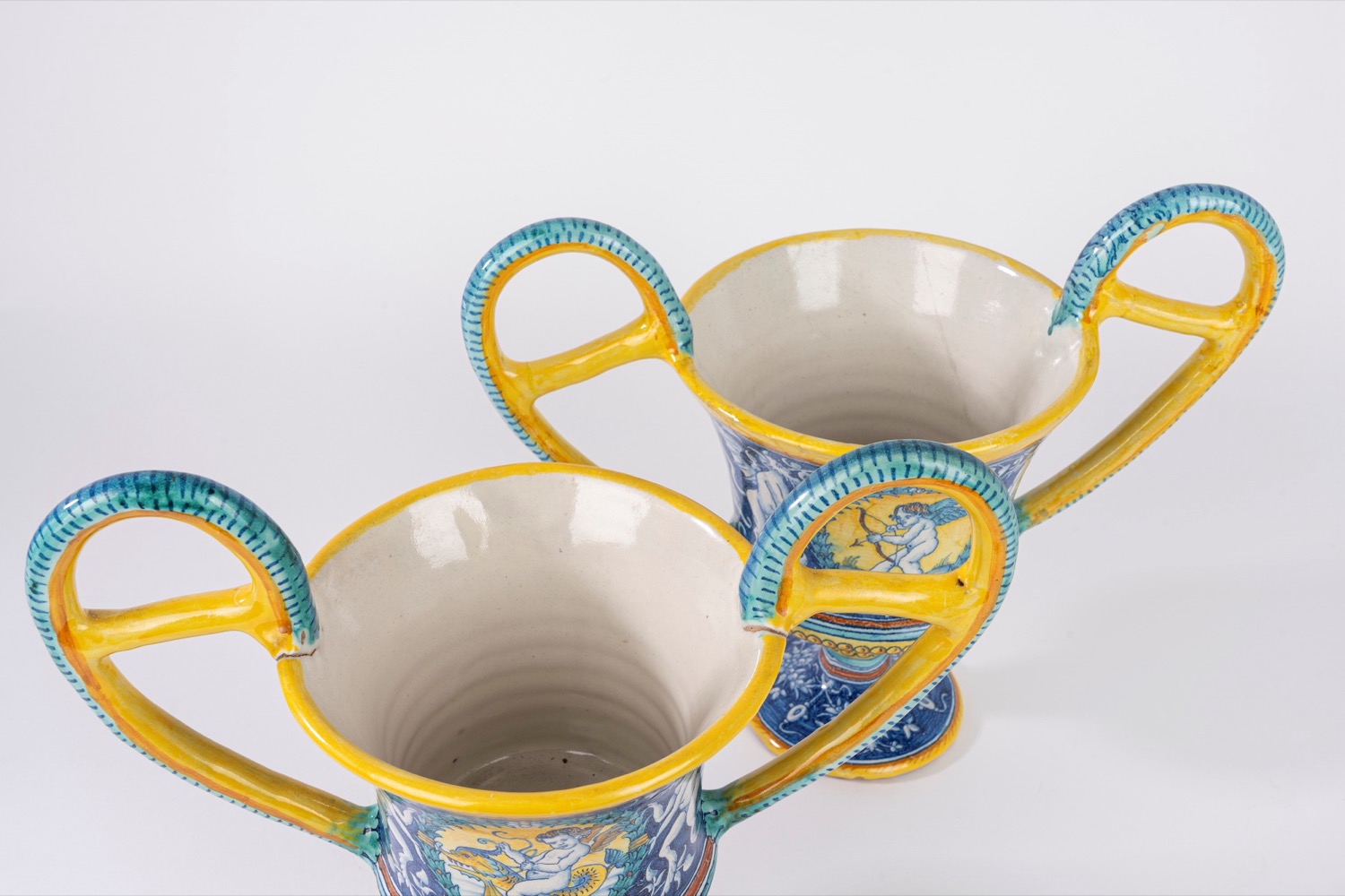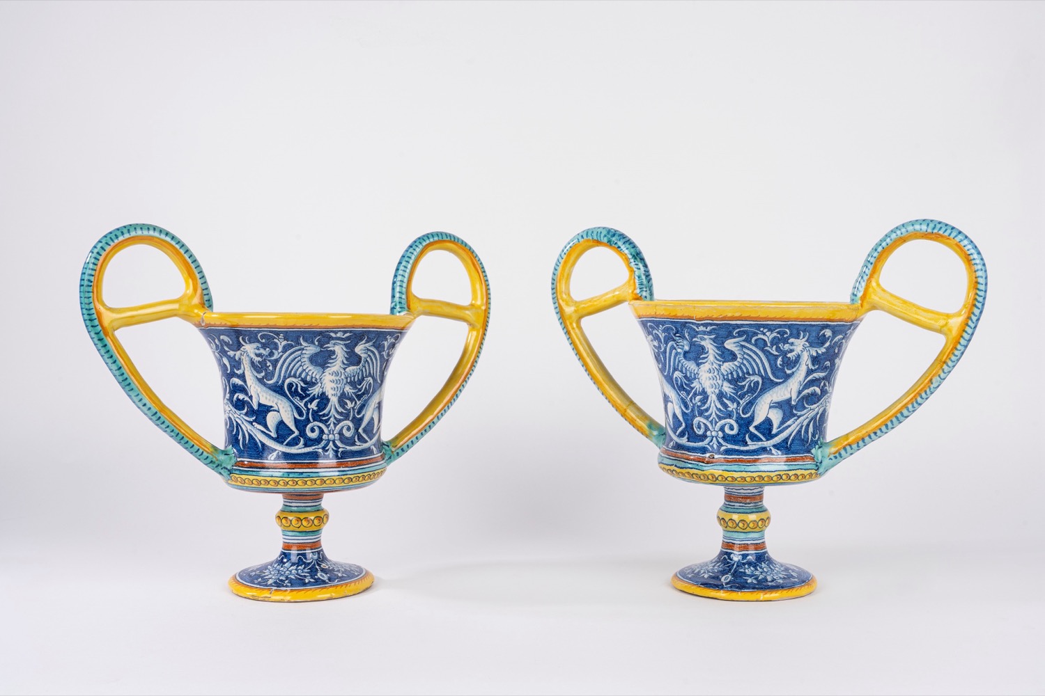 Due coppe biansate in maiolica policroma, Deruta secolo XX