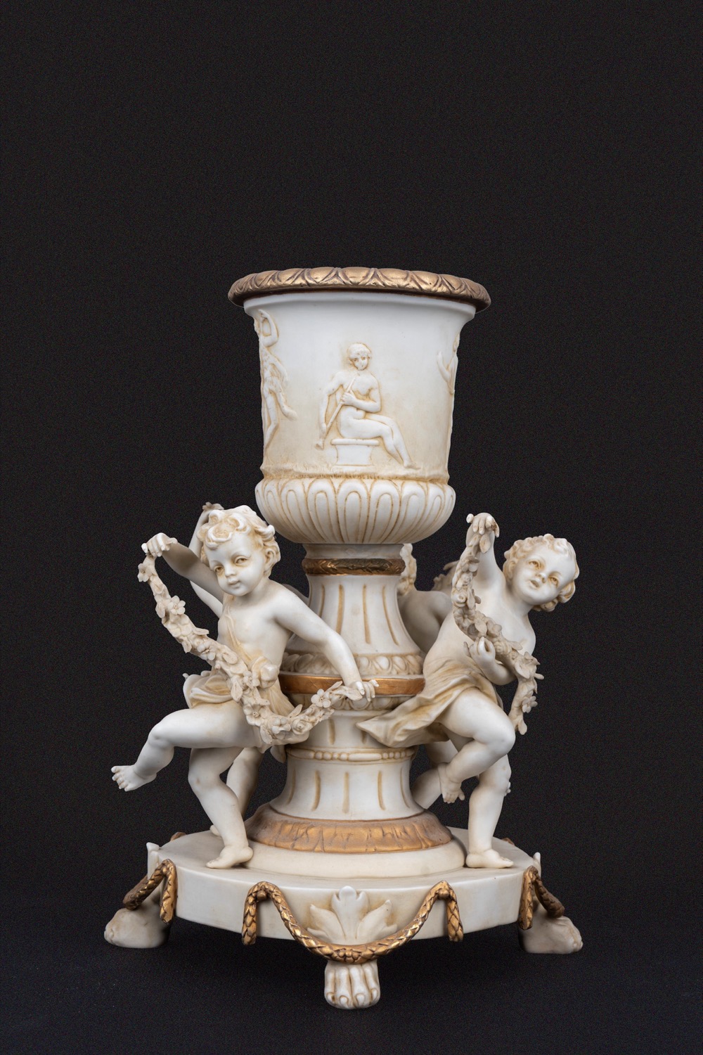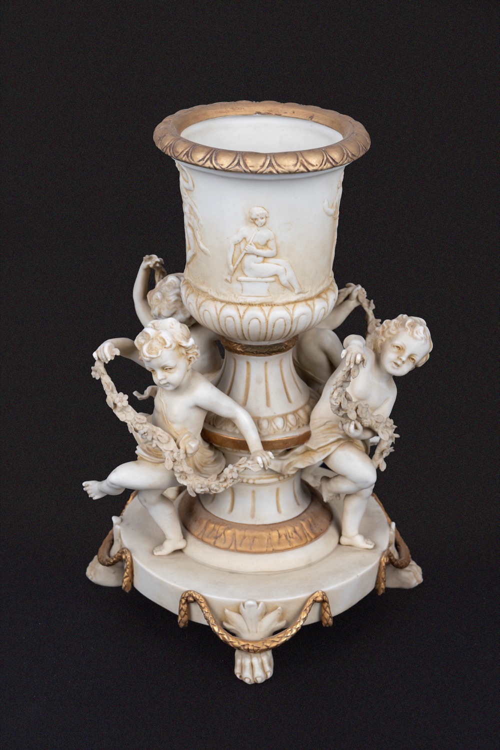 Piccolo vaso a cratere in biscuit con giochi di putti, Germania, secolo XIX