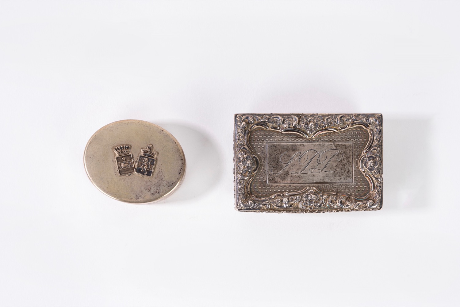 una ovale con stemmi araldici sul coperchio, bollo 800 e bollo Fornari Roma, l'altra con monogramma sul coperchio e bolli inglesiuna ovale con stemmi araldici sul coperchio, bollo 800 e bollo Fornari Roma, l'altra con monogramma sul coperchio e bolli inglesi