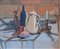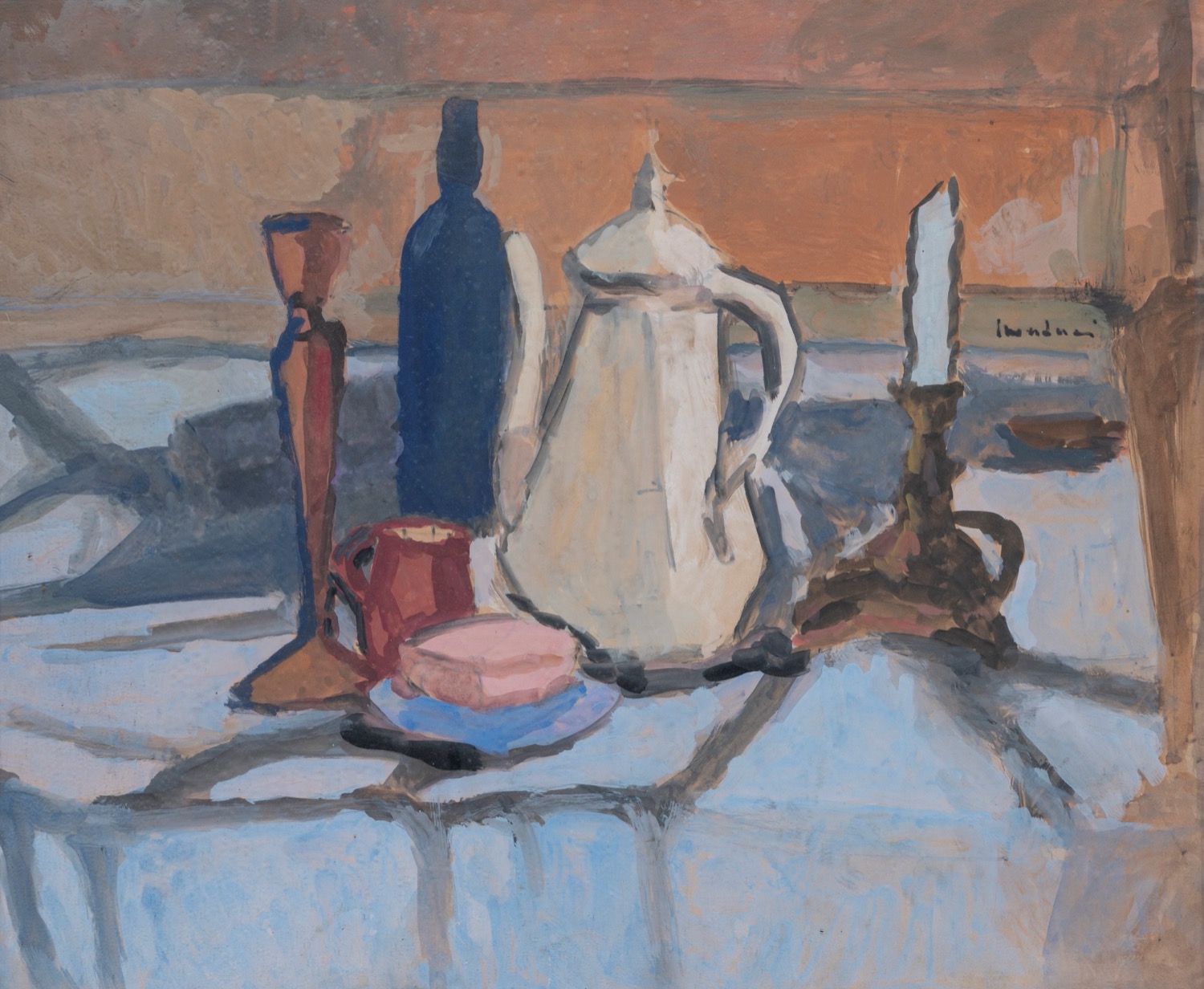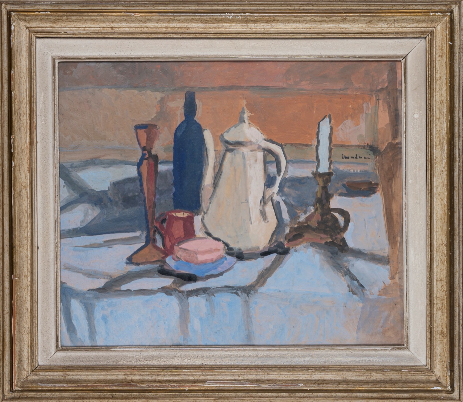 Scuola italiana, secolo XX - Natura morta con bottiglie e candelieri
