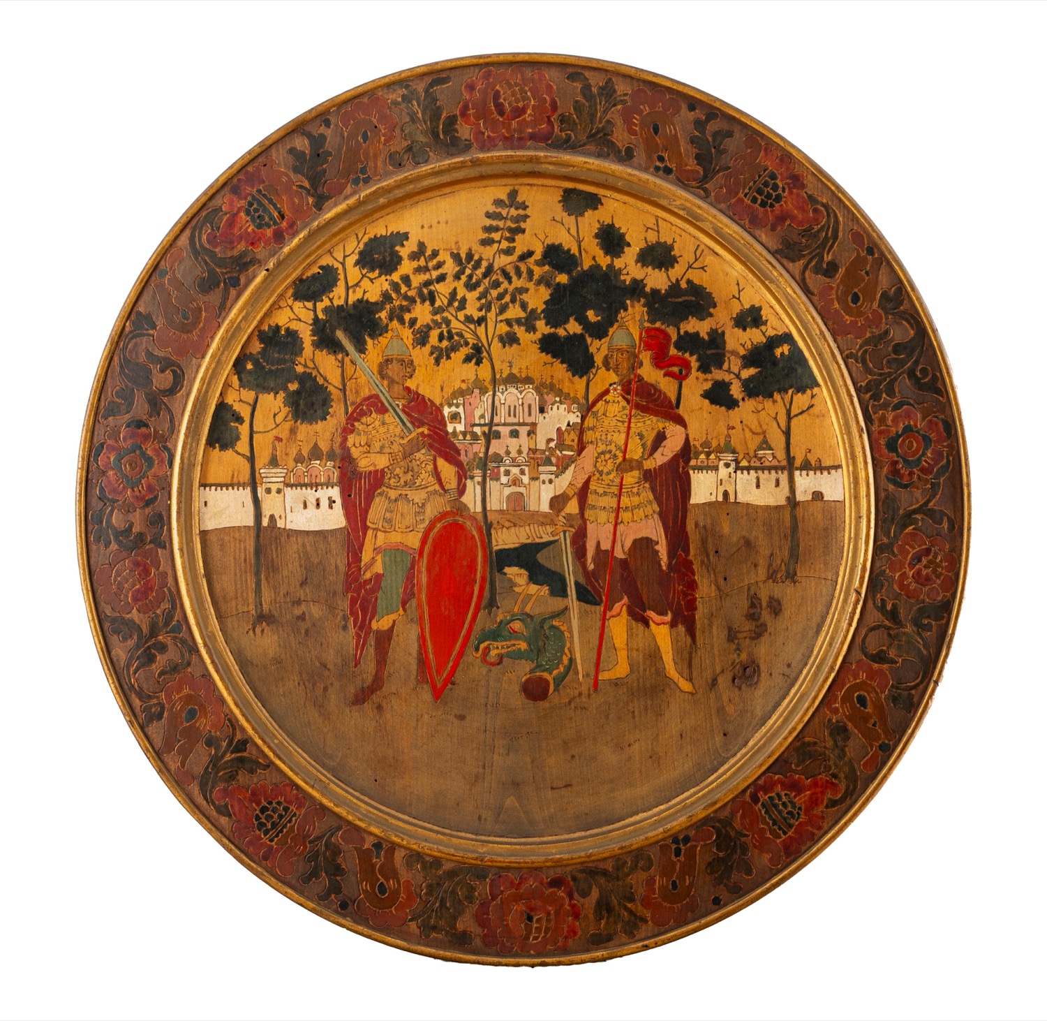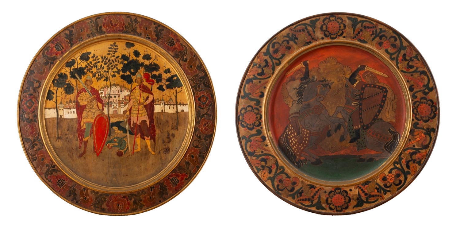 Due grandi piatti da parata in legno dipinto, Russia inizi XX secolo