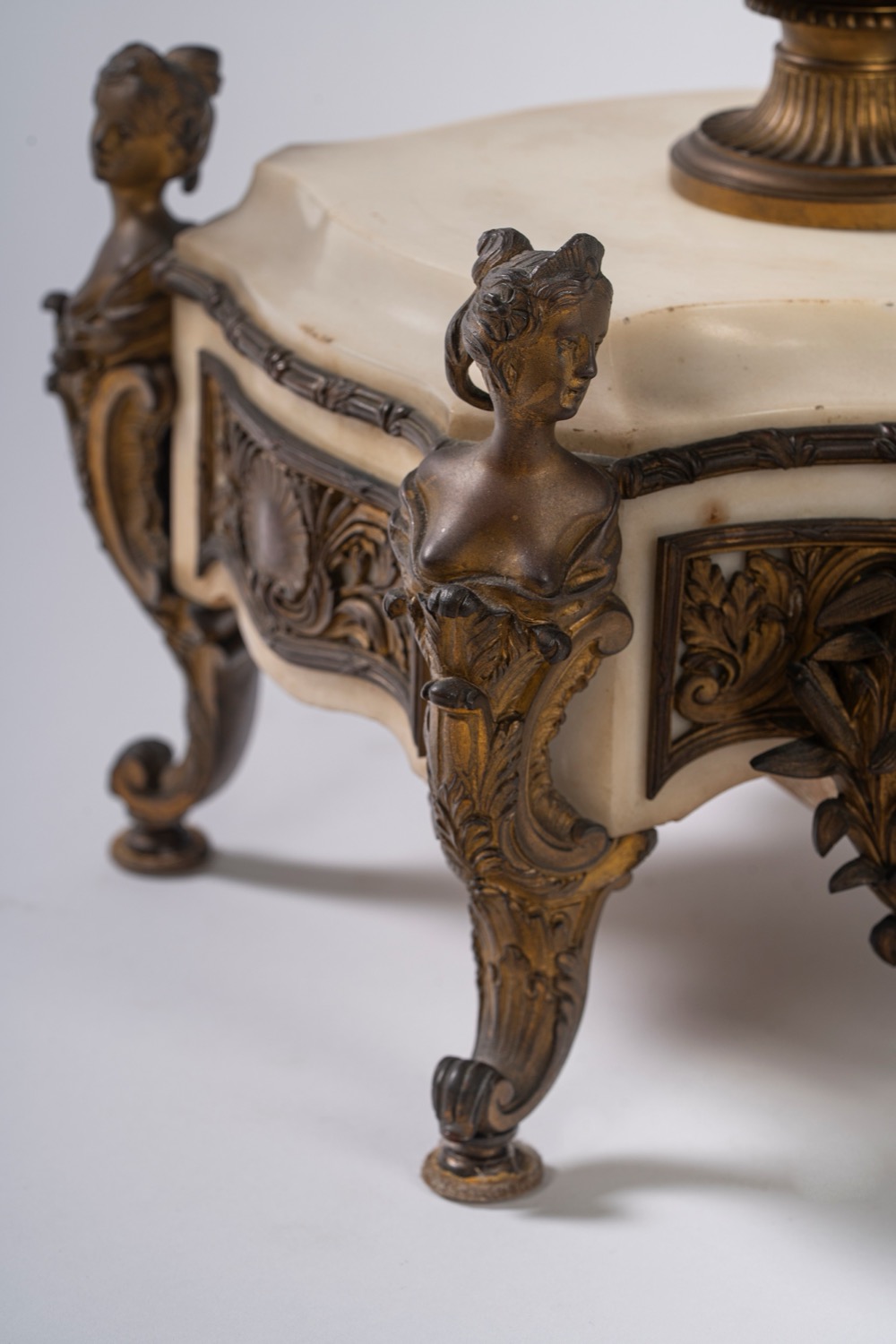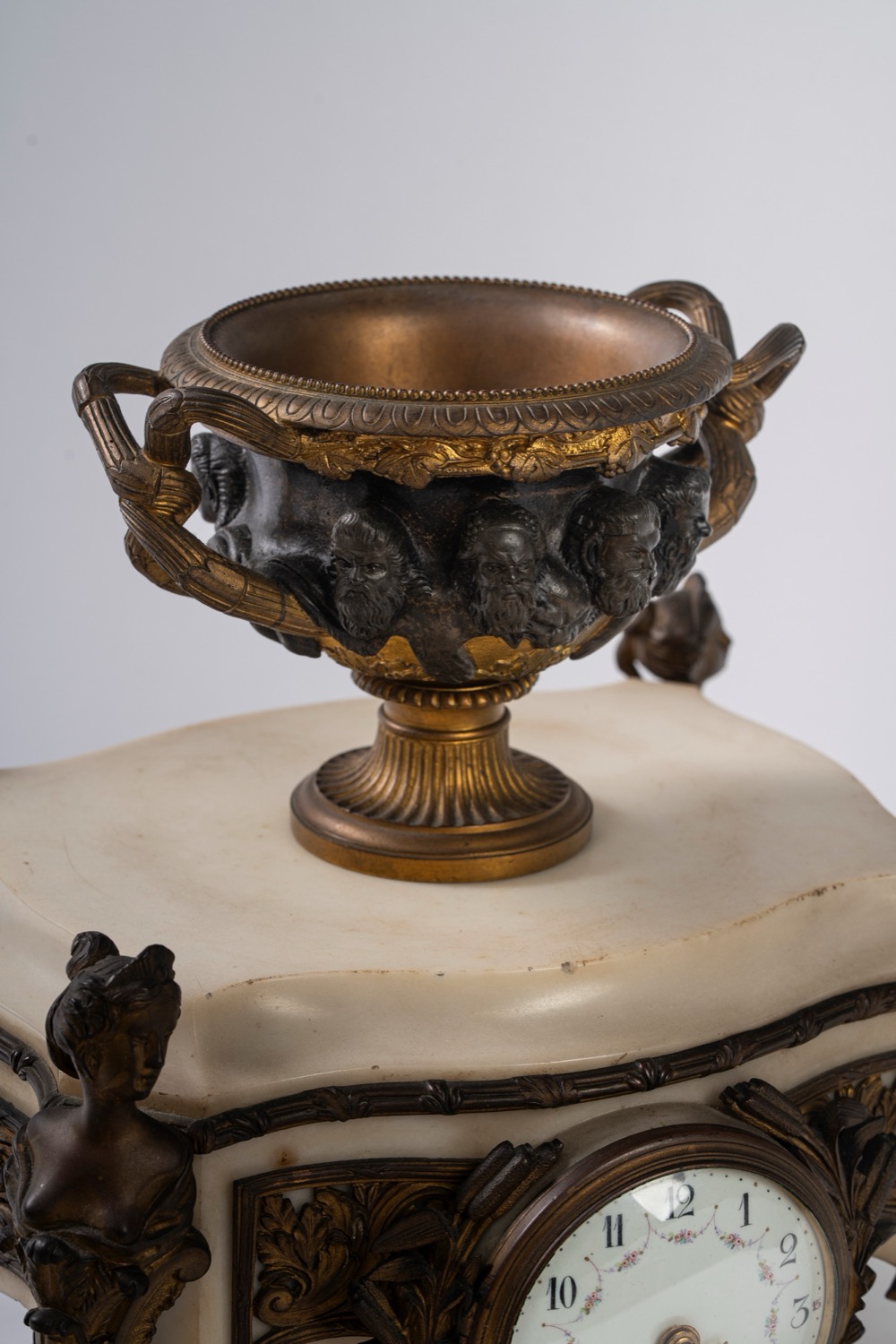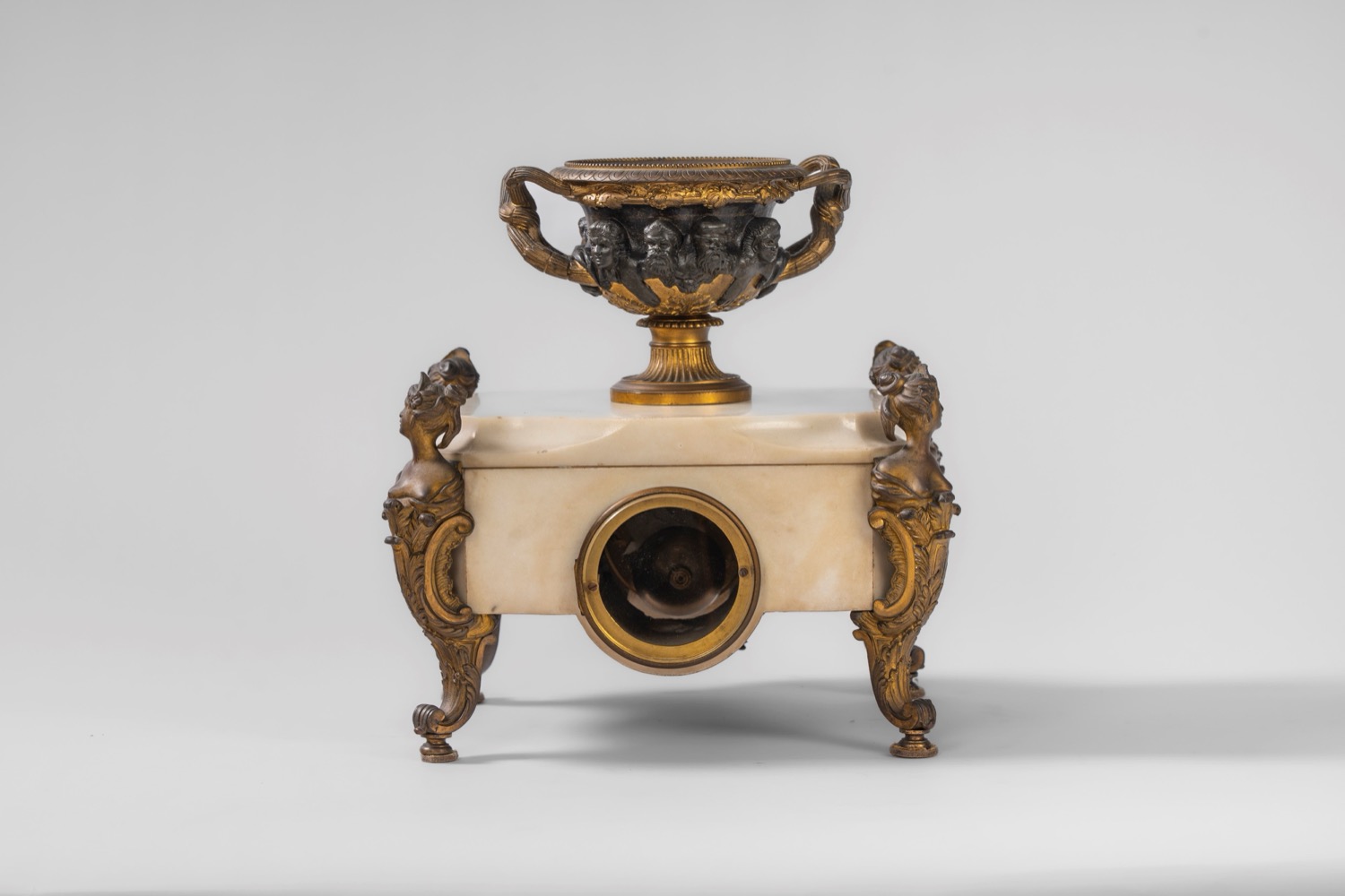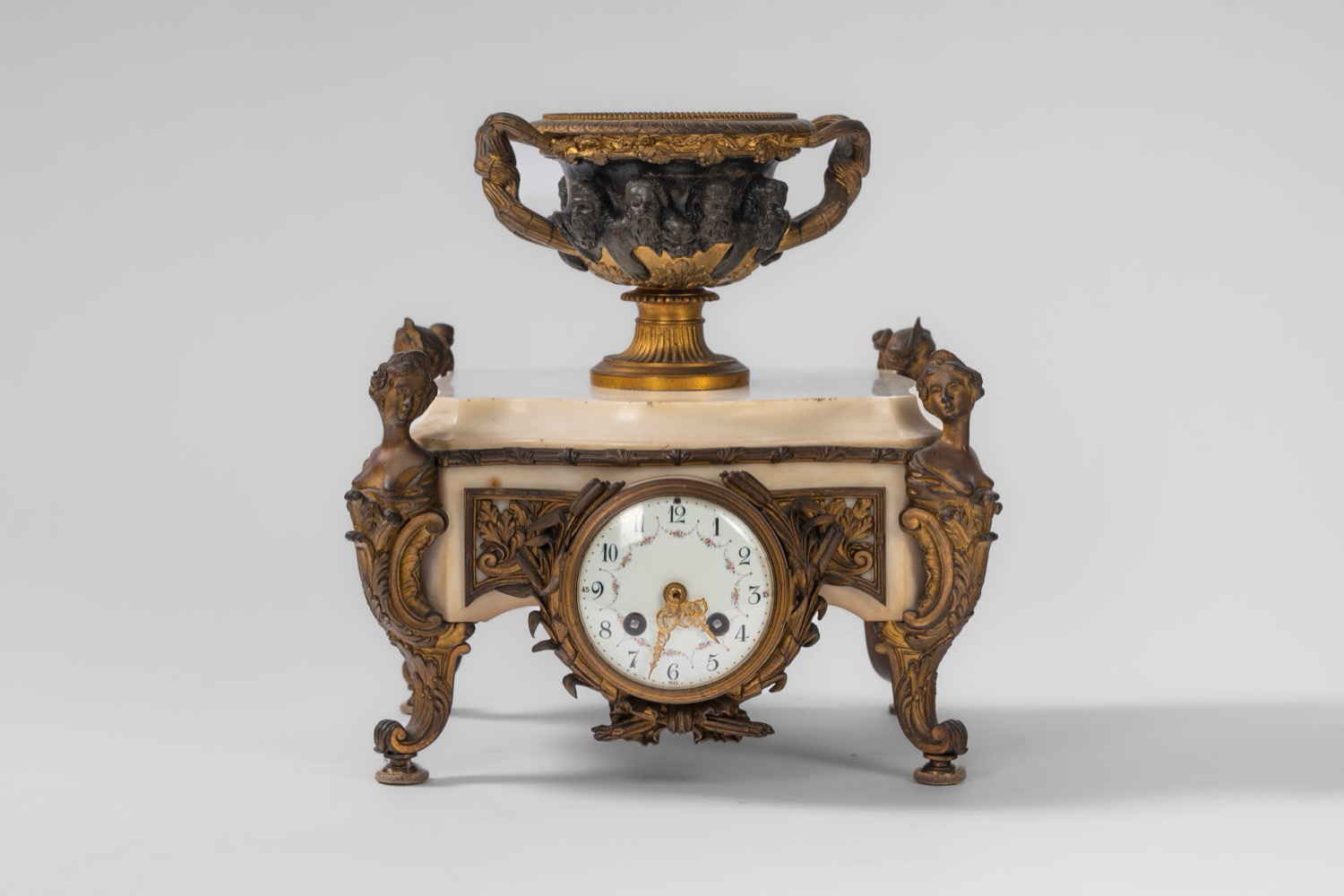 Base in marmo bianco decorato da applicazioni in bronzo dorato, poggiante su quattro piedi a volute sormontati da busti femminili. Quadrante in smalto bianco a numeri arabi decorato da ghirlanda di fiori. Sulla base poggia un vaso biansato con fascia a teste virili sporgenti. Base in marmo bianco decorato da applicazioni in bronzo dorato, poggiante su quattro piedi a volute sormontati da busti femminili. Quadrante in smalto bianco a numeri arabi decorato da ghirlanda di fiori. Sulla base poggia un vaso biansato con fascia a teste virili sporgenti.
