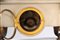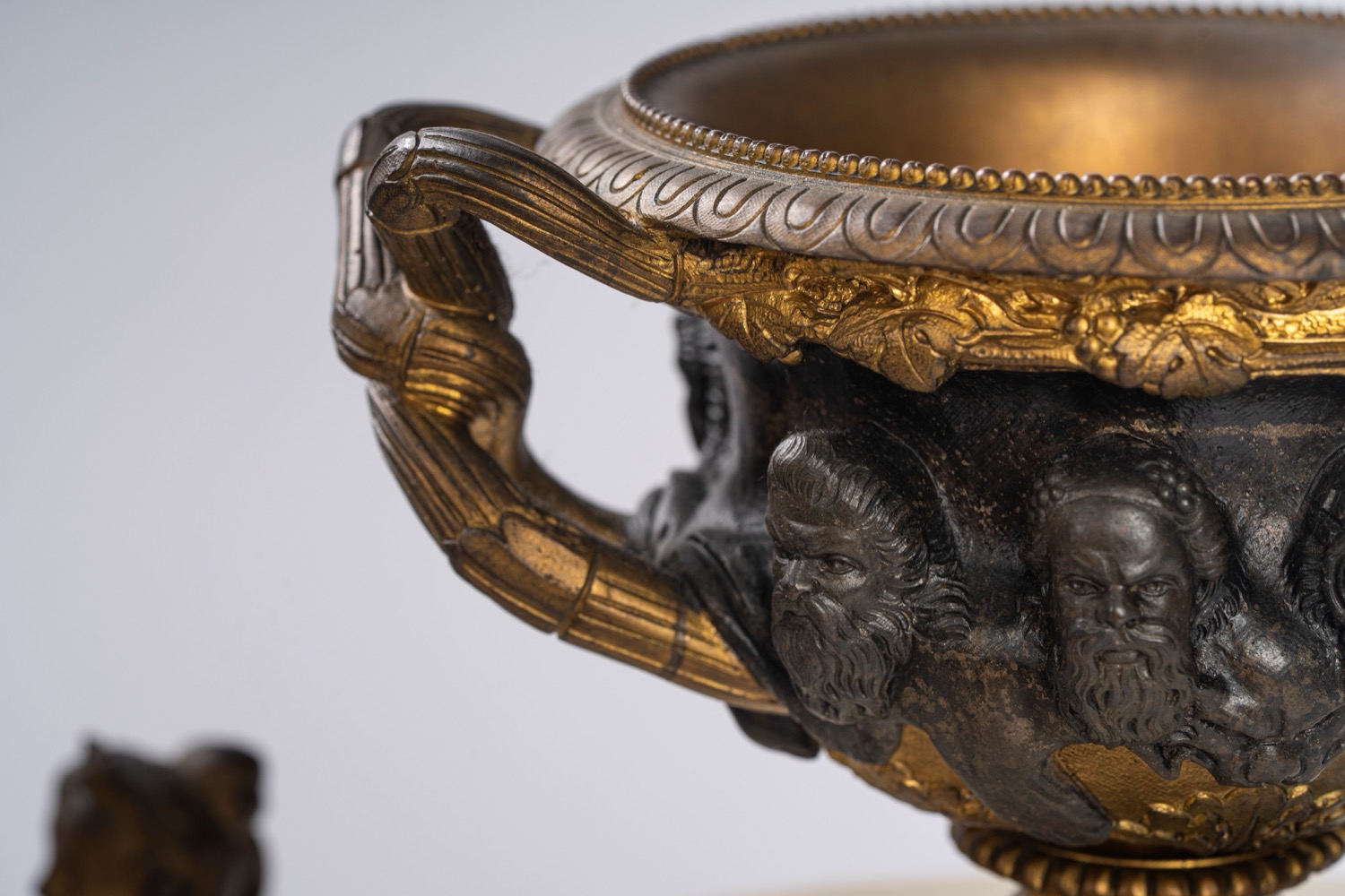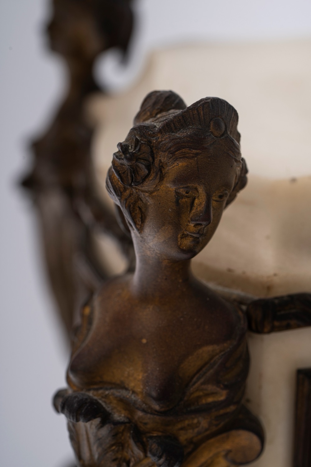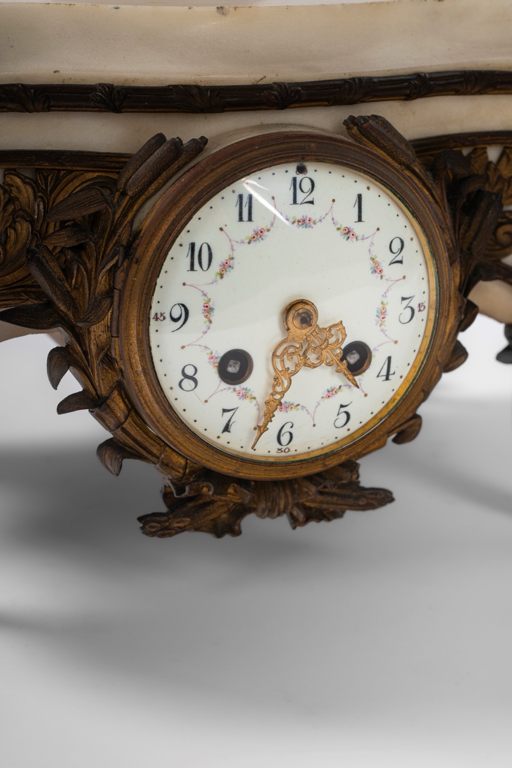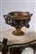 Base in marmo bianco decorato da applicazioni in bronzo dorato, poggiante su quattro piedi a volute sormontati da busti femminili. Quadrante in smalto bianco a numeri arabi decorato da ghirlanda di fiori. Sulla base poggia un vaso biansato con fascia a teste virili sporgenti. Base in marmo bianco decorato da applicazioni in bronzo dorato, poggiante su quattro piedi a volute sormontati da busti femminili. Quadrante in smalto bianco a numeri arabi decorato da ghirlanda di fiori. Sulla base poggia un vaso biansato con fascia a teste virili sporgenti.