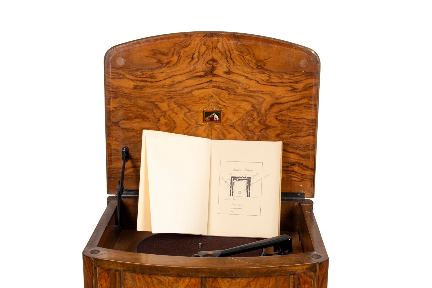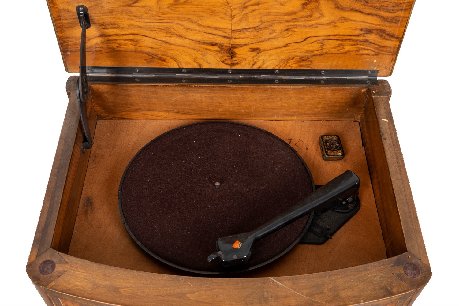 meccanismo da revisionarecon piano apribile e giradischi all'interno, libretto originale per memorizzare le stazioni e scatolina con puntine di ricambio