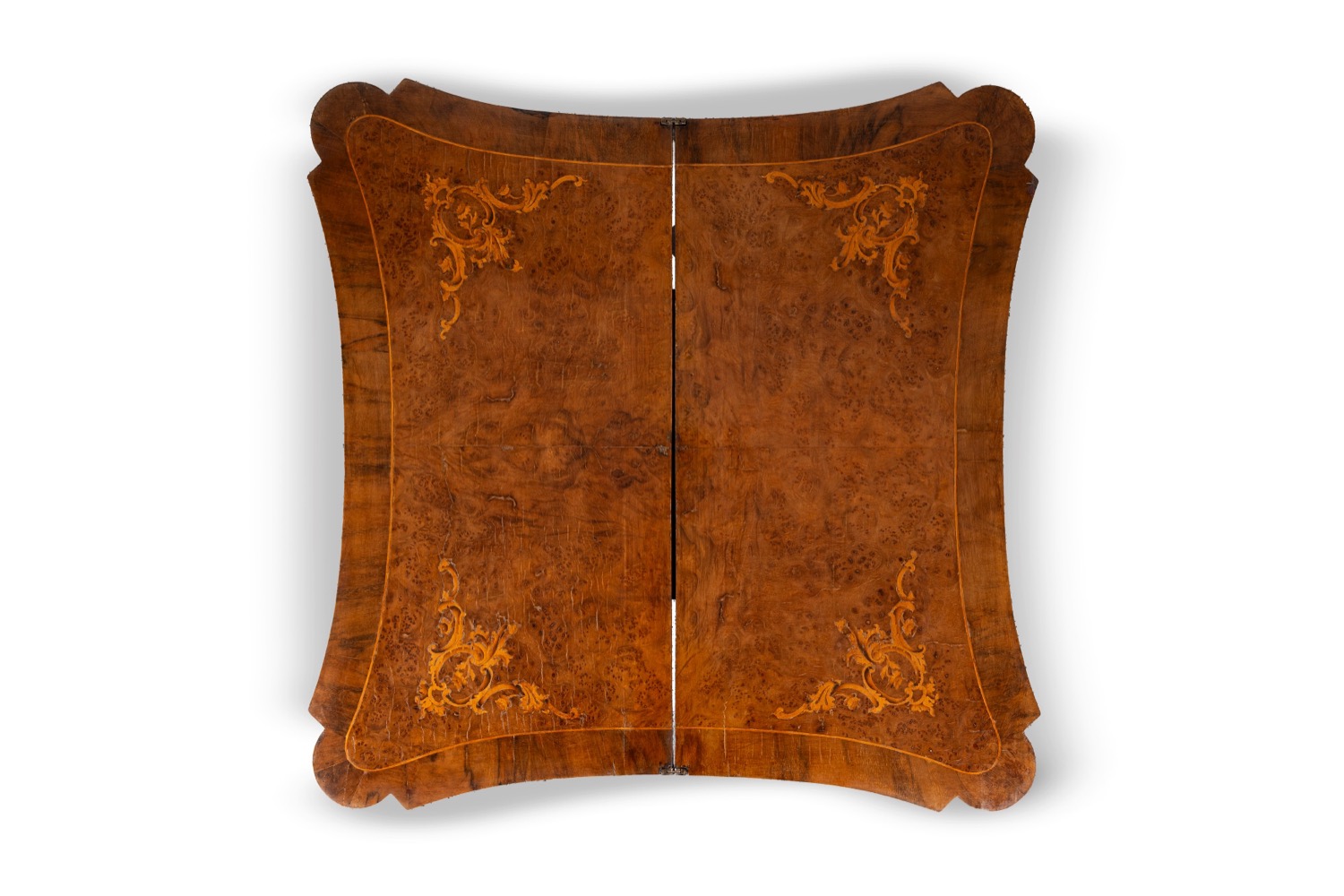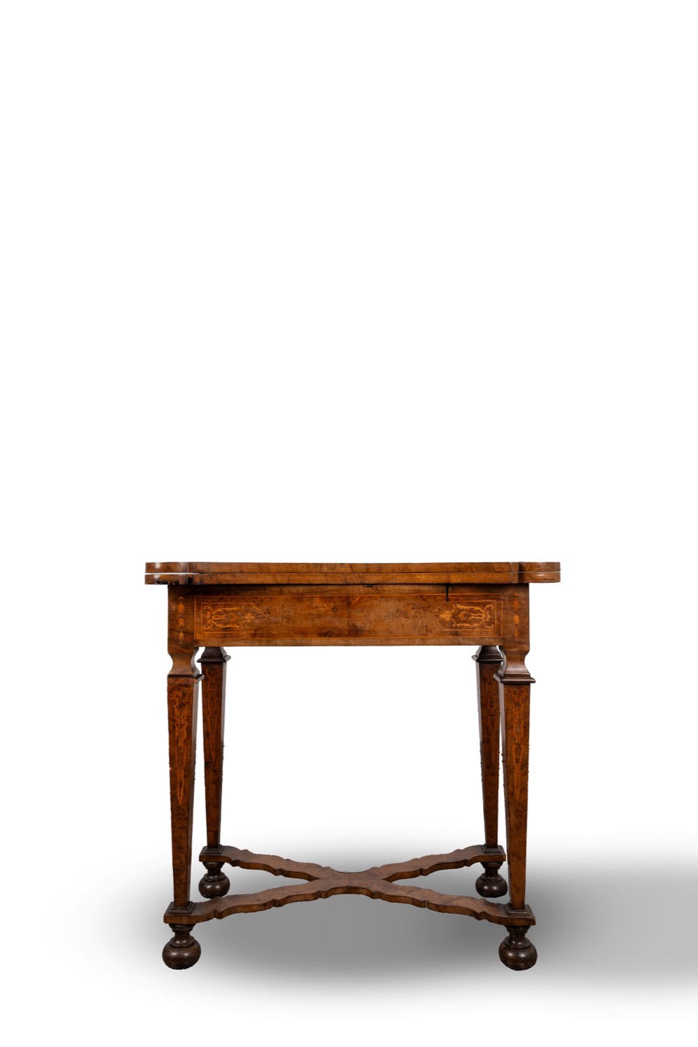 piano di forma mistilinea intarsiato con motivi a girali vegetali e gambe a obelisco rovesciato raccordate da crociera.