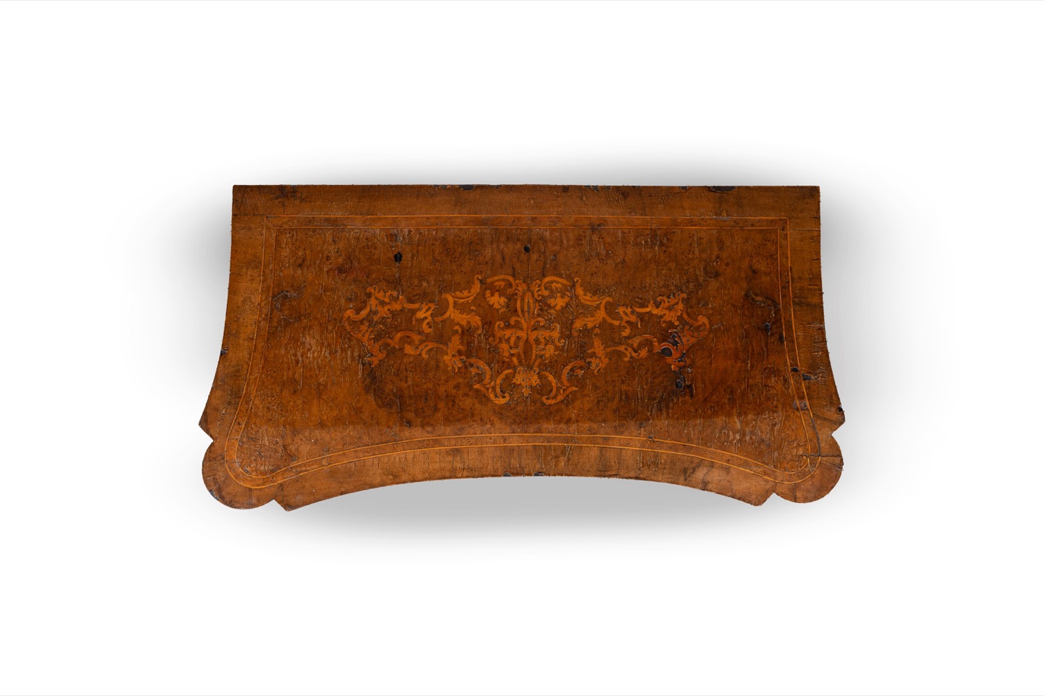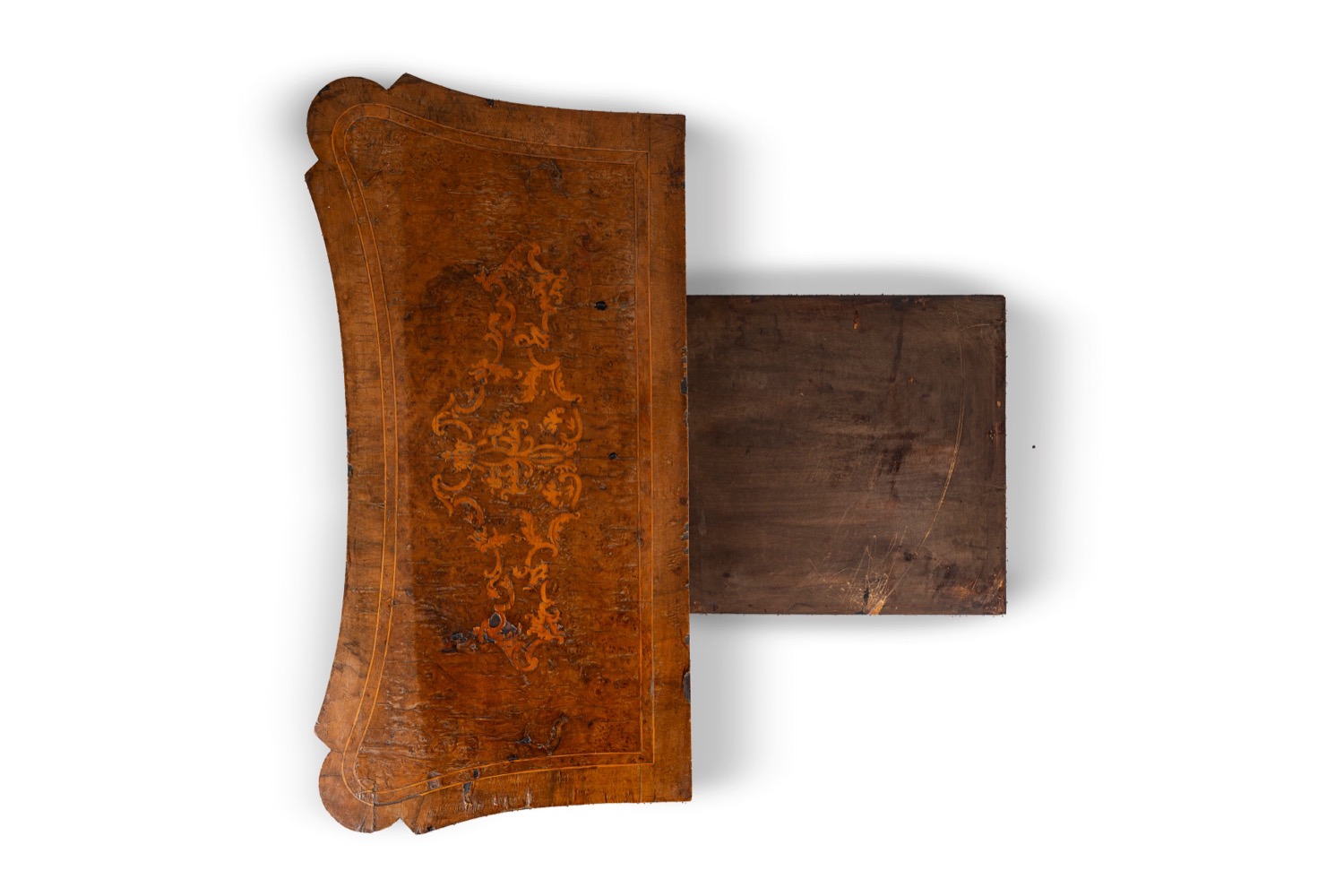 Difetti e mancanzepiano di forma mistilinea intarsiato con motivi a girali vegetali e gambe a obelisco rovesciato raccordate da crociera.