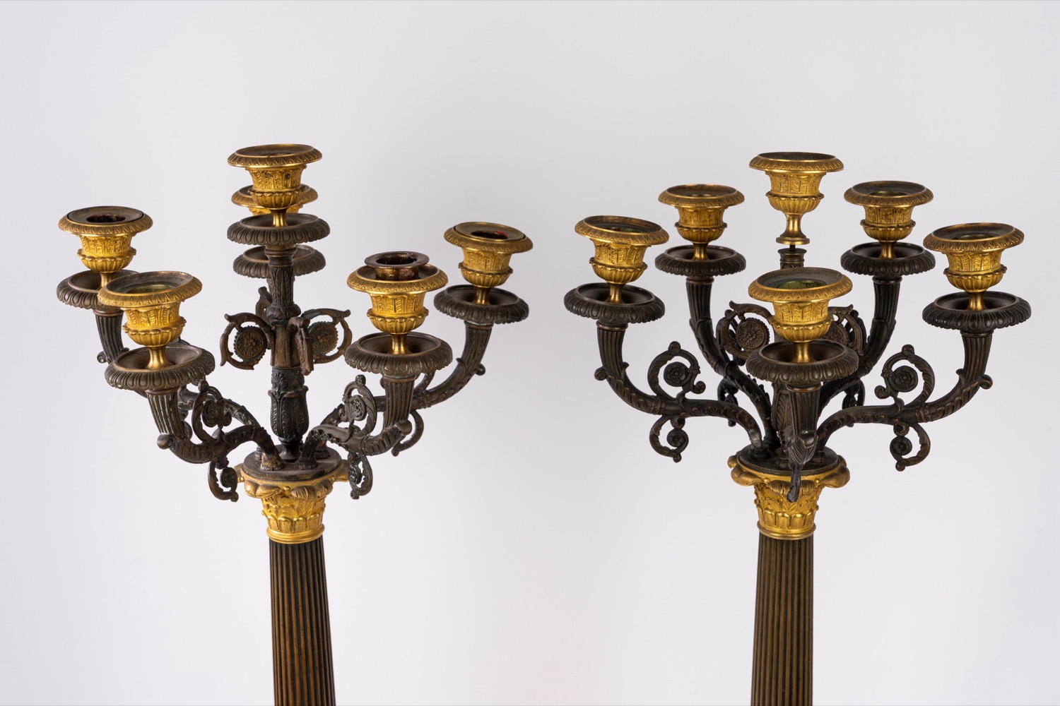 Coppia di candelabri Impero in bronzo dorato e a patina scura, secolo XIX
