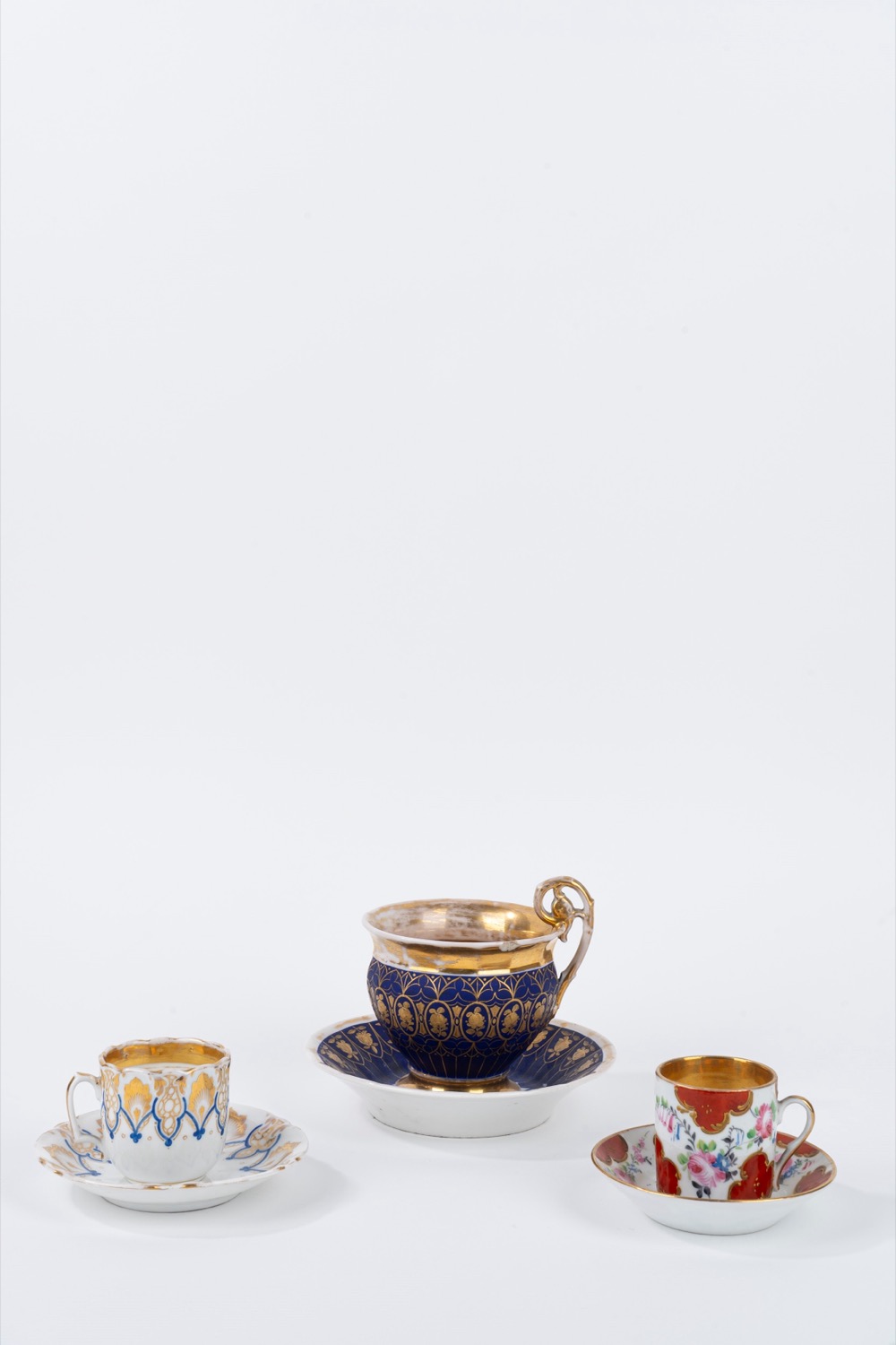 Lotto di tre tazze in porcellana policroma, con piattino, secolo XIX
