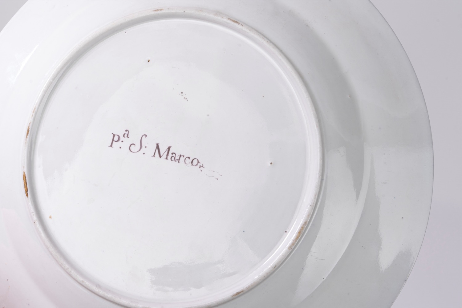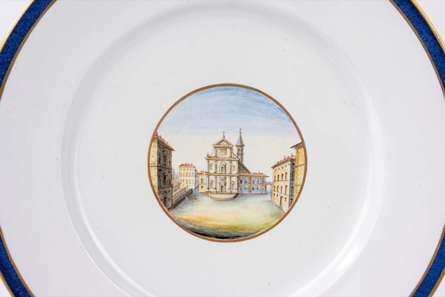 Questo piatto appartiene alla serie "a vedute", prodotta dalla manifattura Ginori tra il 1792 e il 1837, sotto la direzione di Carlo Leopoldo Ginori. Questo tipo di decorazione era tipica del pittore Ferdinando Ammannati, attivo a Doccia dal 1808 al 1823.veduta centrale policroma su fondo bianco raffigurante Piazza San Marco a Firenze, con bordo blu e filettatura in oro nella tesa