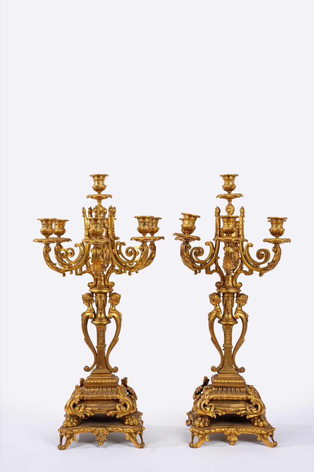Coppia di importanti candelabri in bronzo dorato, fine secolo XIX - inizi secolo XX