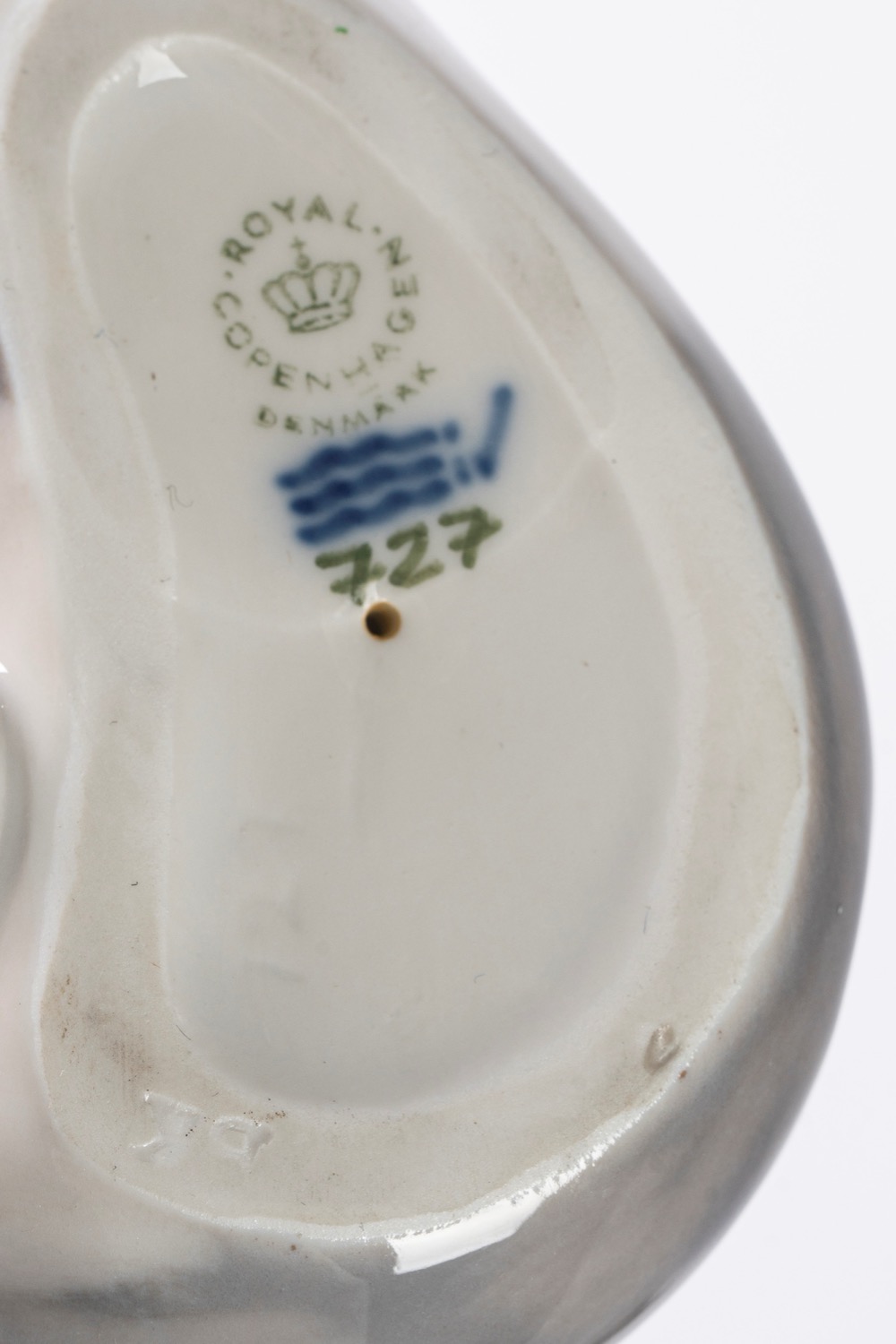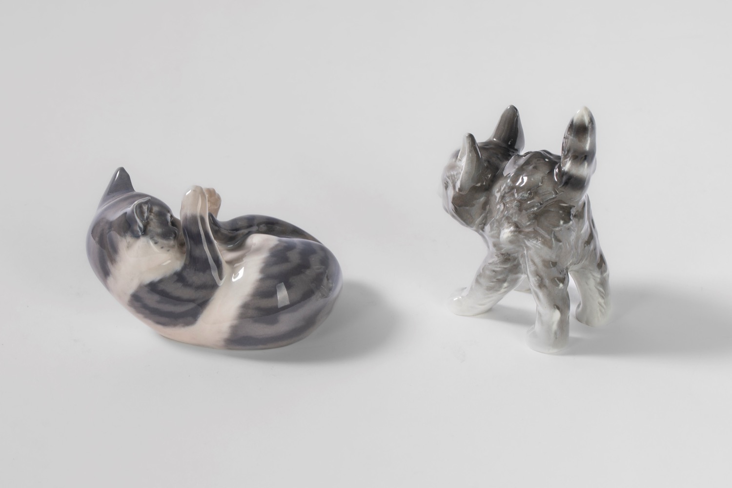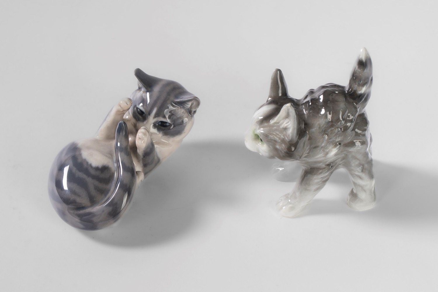 Due gattini in porcellana policroma. Uno Royal Copenaghen, Danimarca, l'altro di differente manifattura, entrambi secolo XX