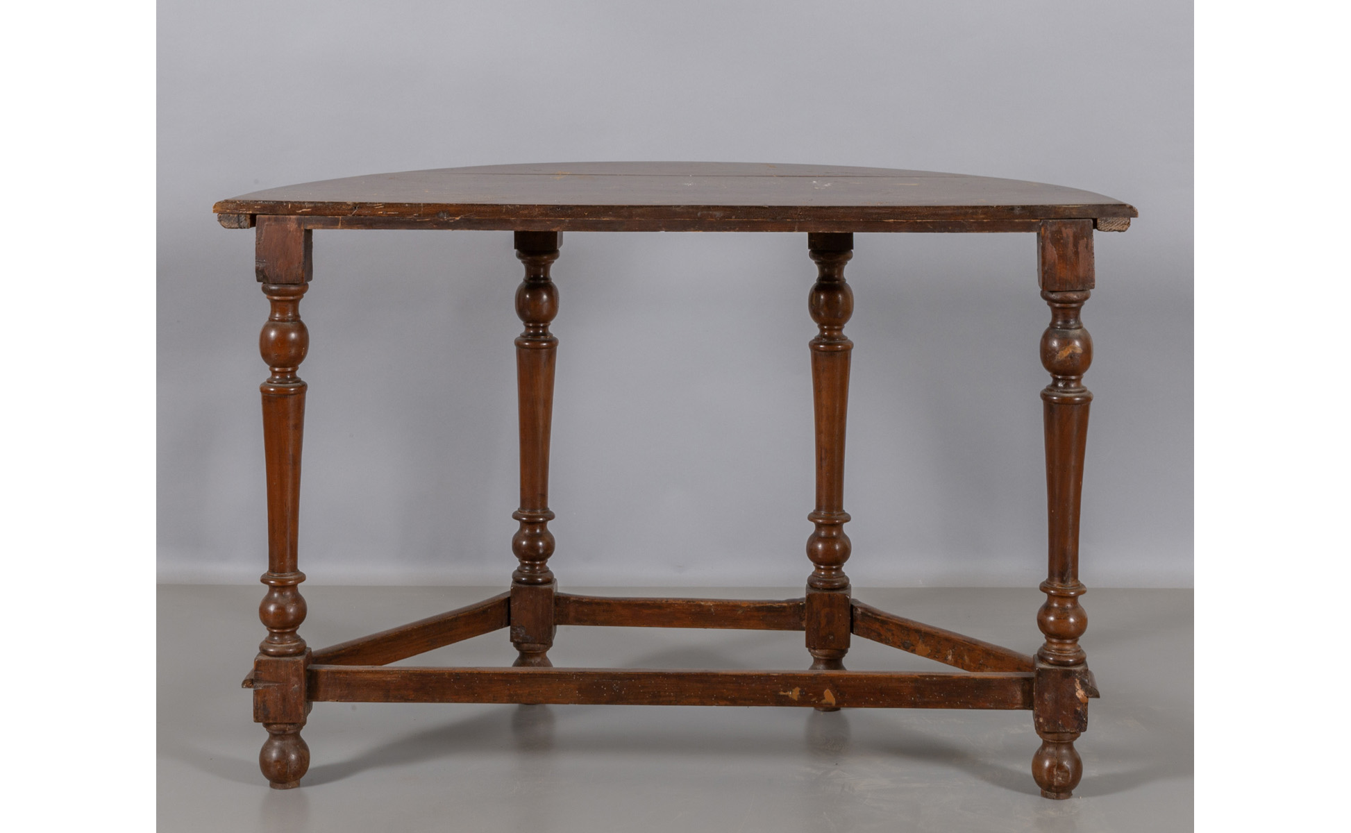 Tavolo a mezzaluna, gambe a bottiglia in noce, inizi sec.XVIII