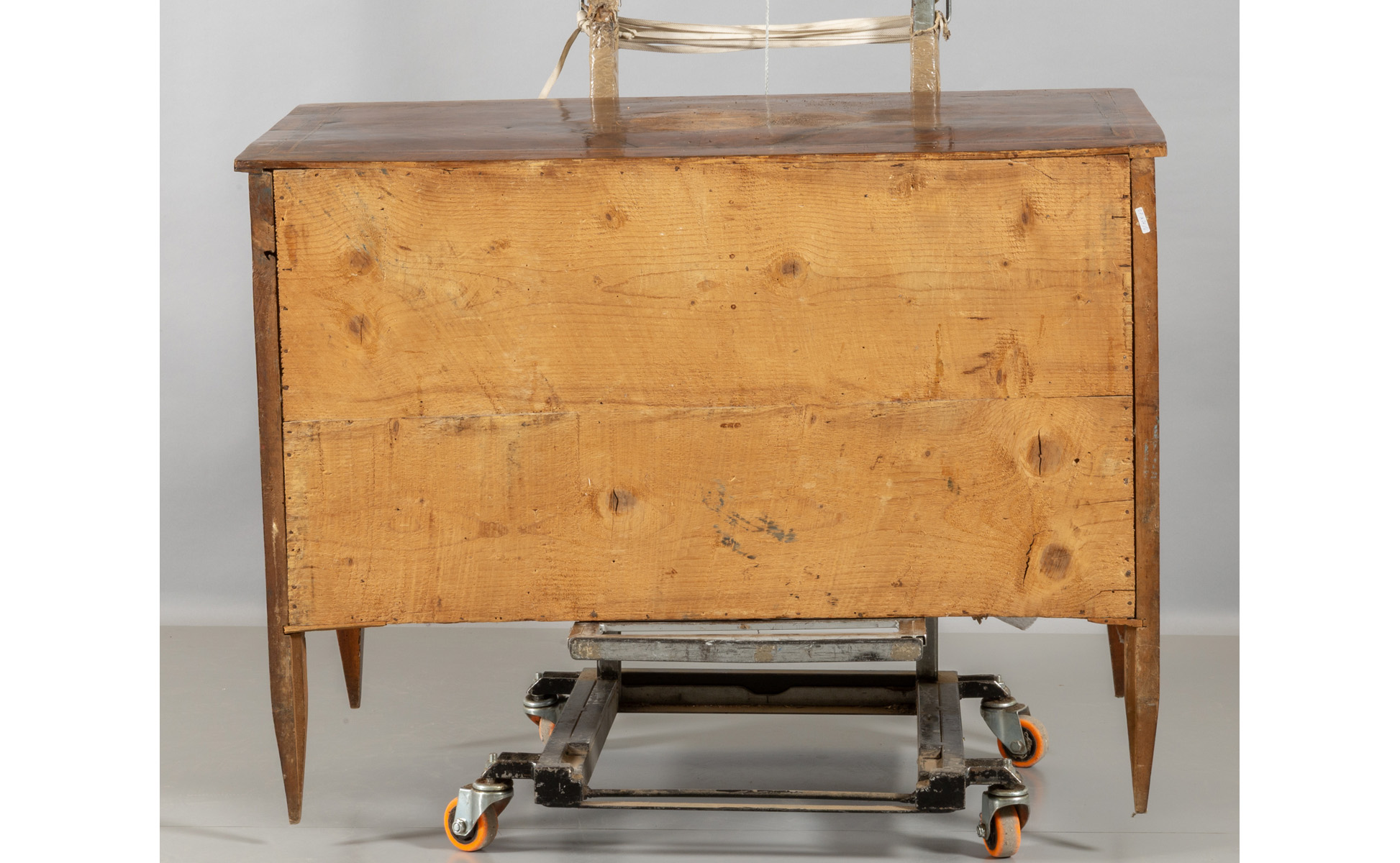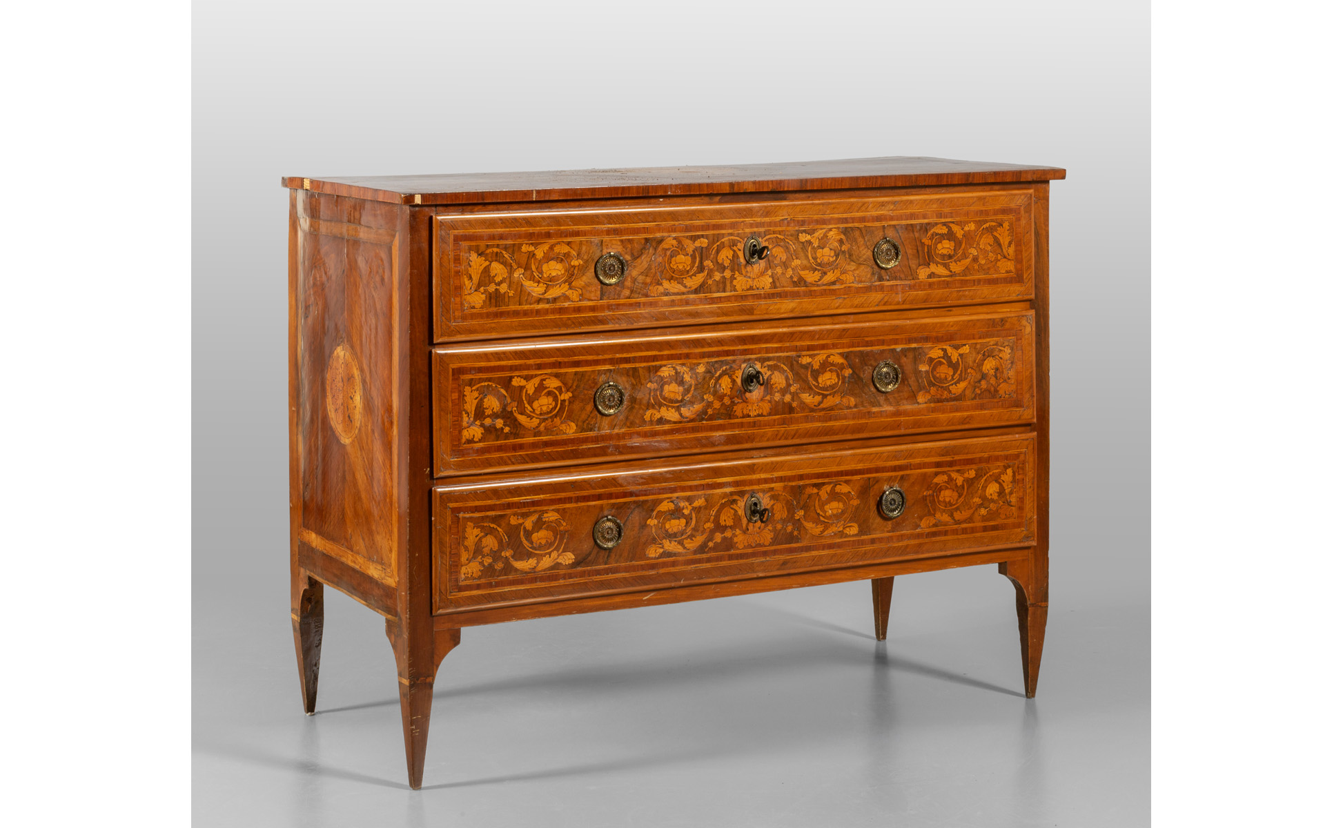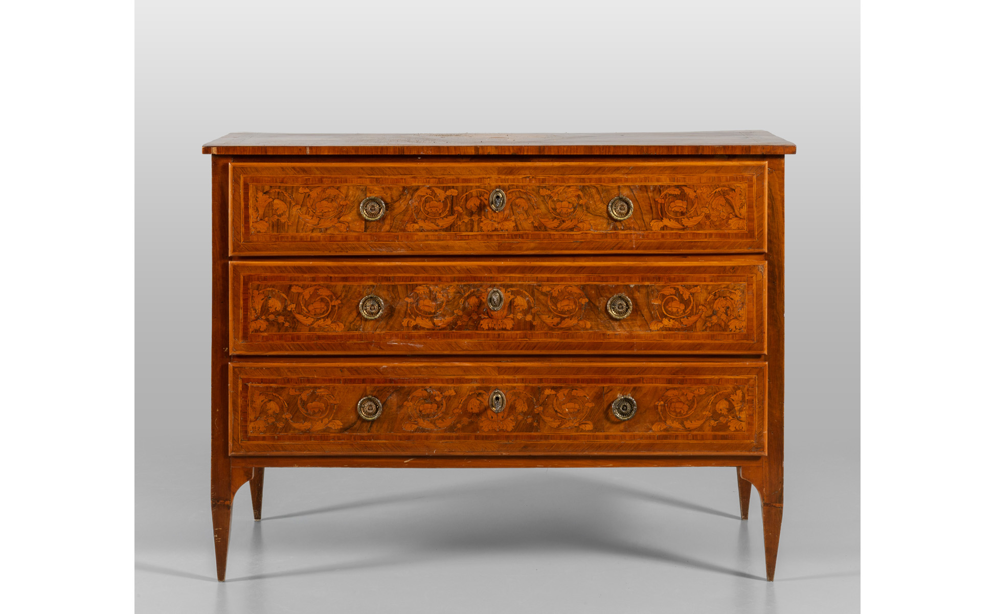 Comò Luigi XVI a tre cassetti lastronato in noce e intarsiato in legni di frutto anche sul piano, Piacenza fine sec.XVIII