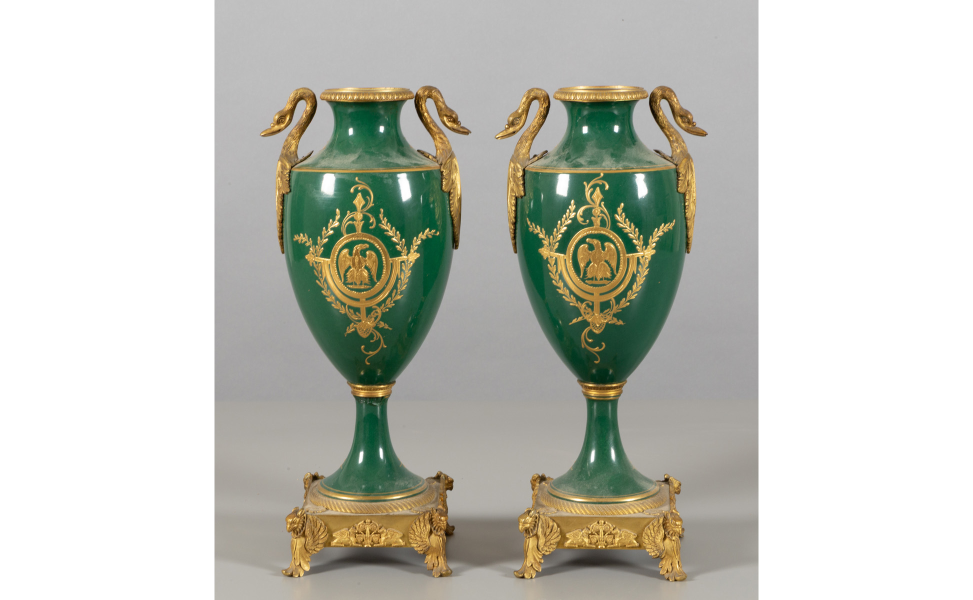 Coppia di vasi in porcellana verde decorati con scene della vita di Napoleone, ricca decorazione in bronzo, fine sec.XIX