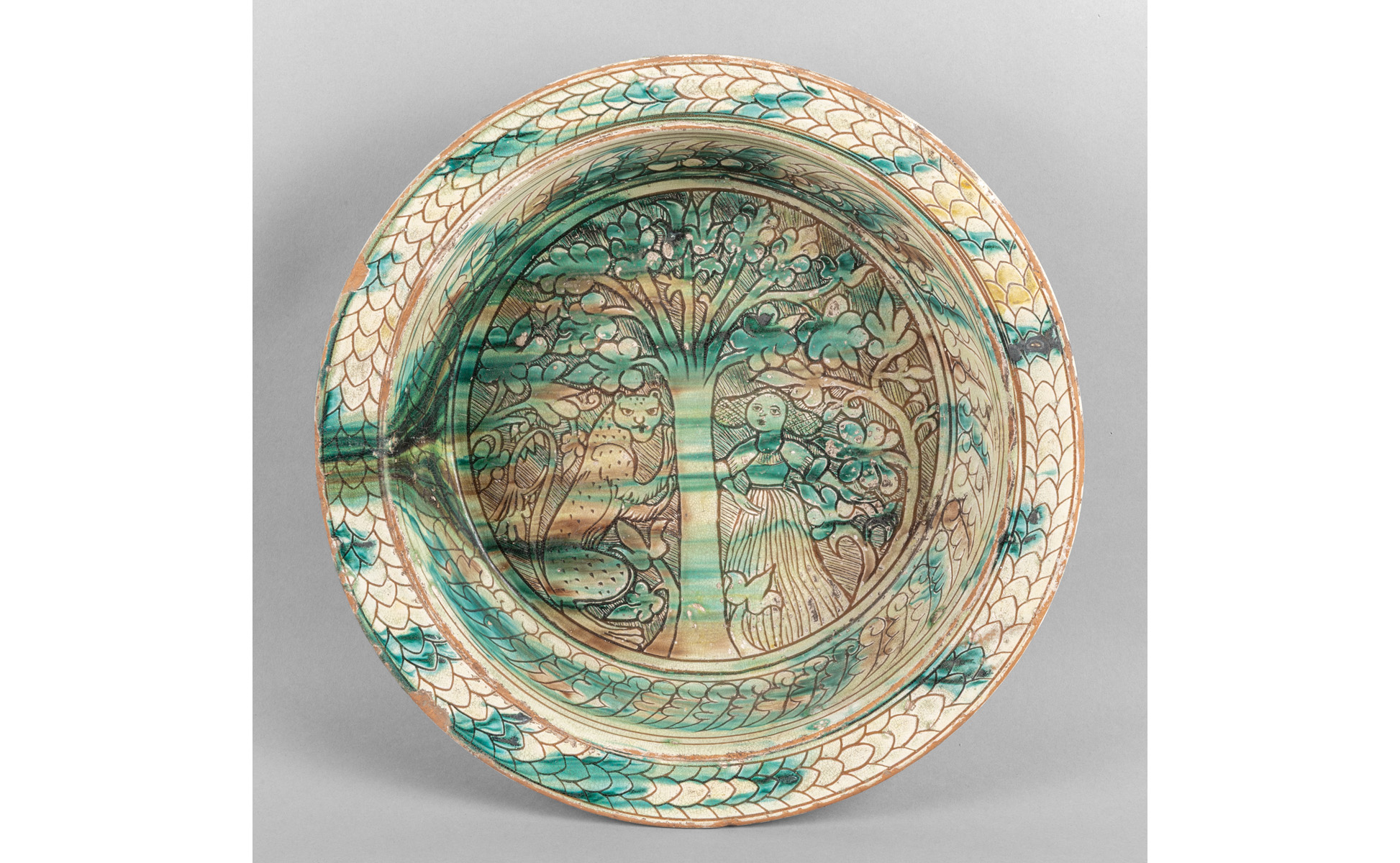 Grande catino in maiolica graffita con personaggi ed animale intorno ad un albero, Orvieto sec.XVIII