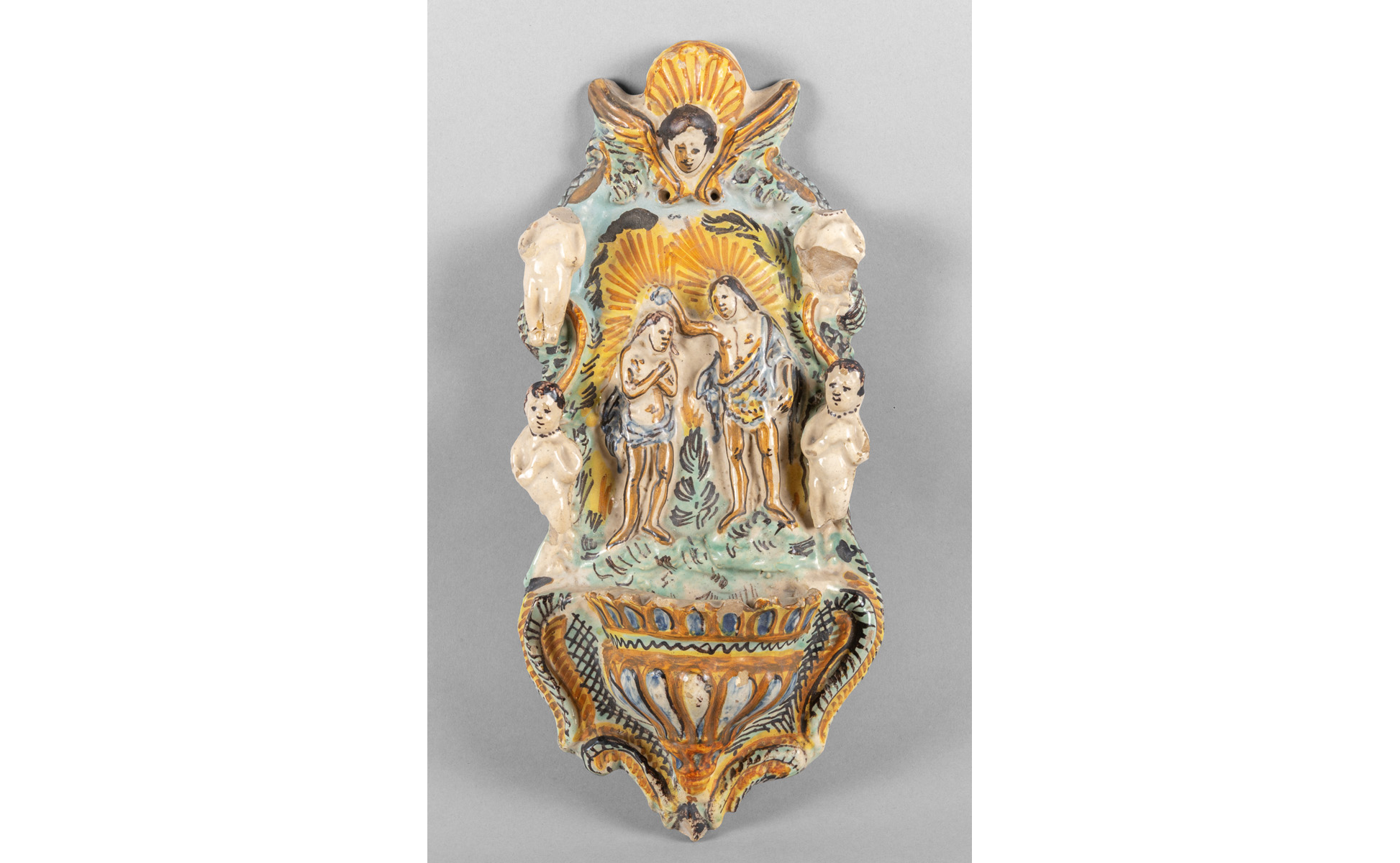 Acquasantiera in maiolica policroma raffigurante il battesimo di Gesù, Centro Italia sec.XVIII