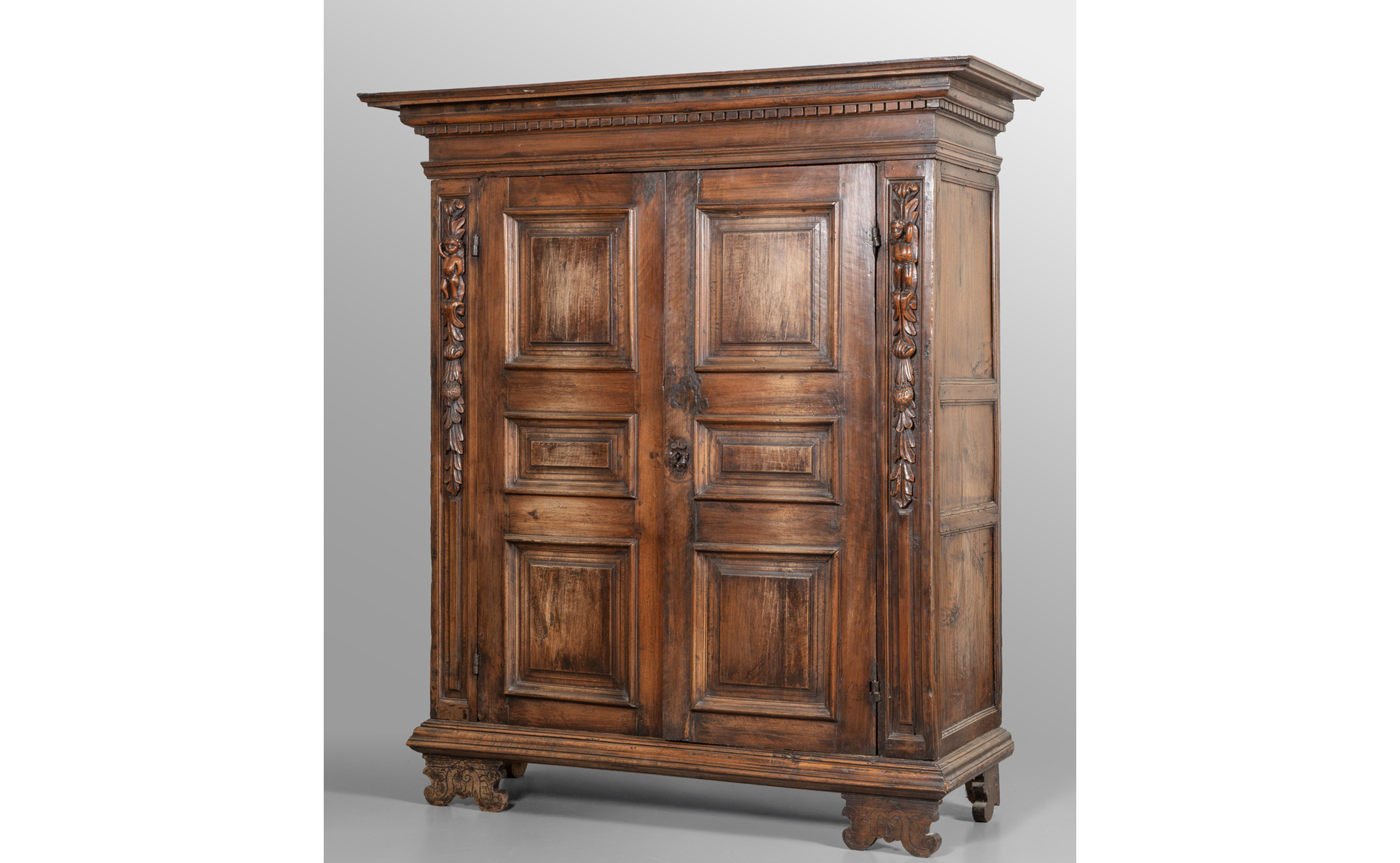 Armadio Luigi XIV in noce, montanti scolpiti a bambocci, porte pannellate, Piemonte fine sec.XVII