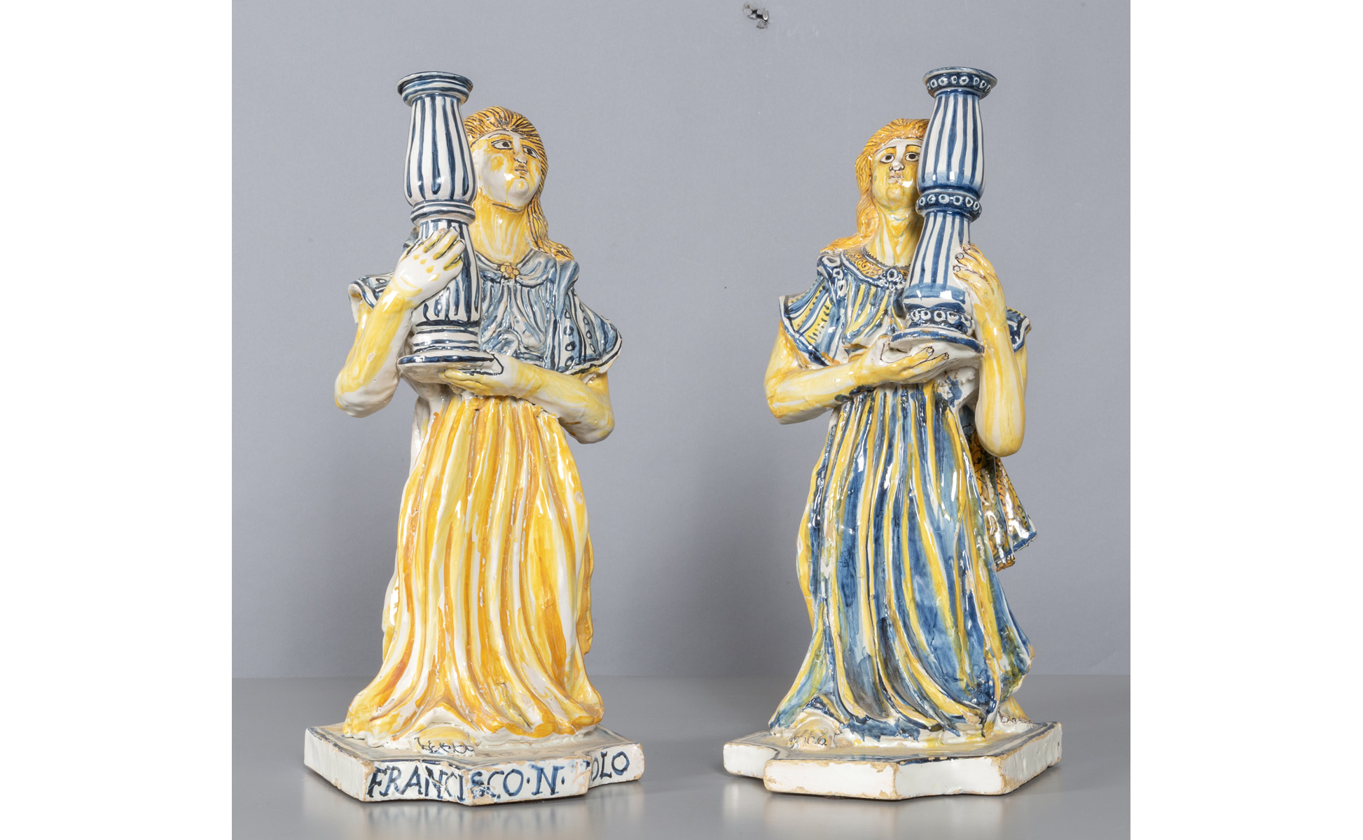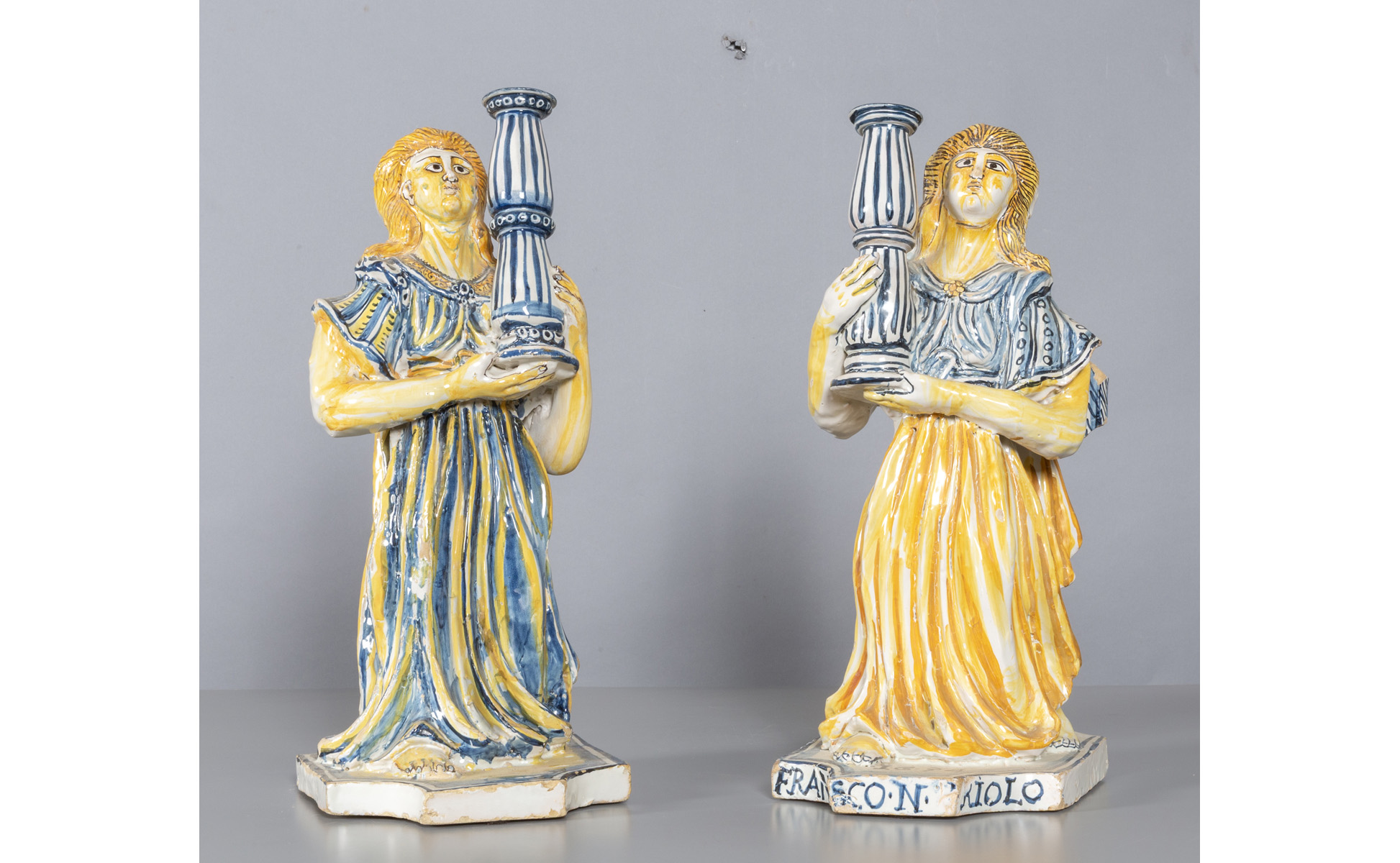 Coppia di angeli reggicandela in maiolica policroma, d.ti alla base 1634, Castelli sec.XVII