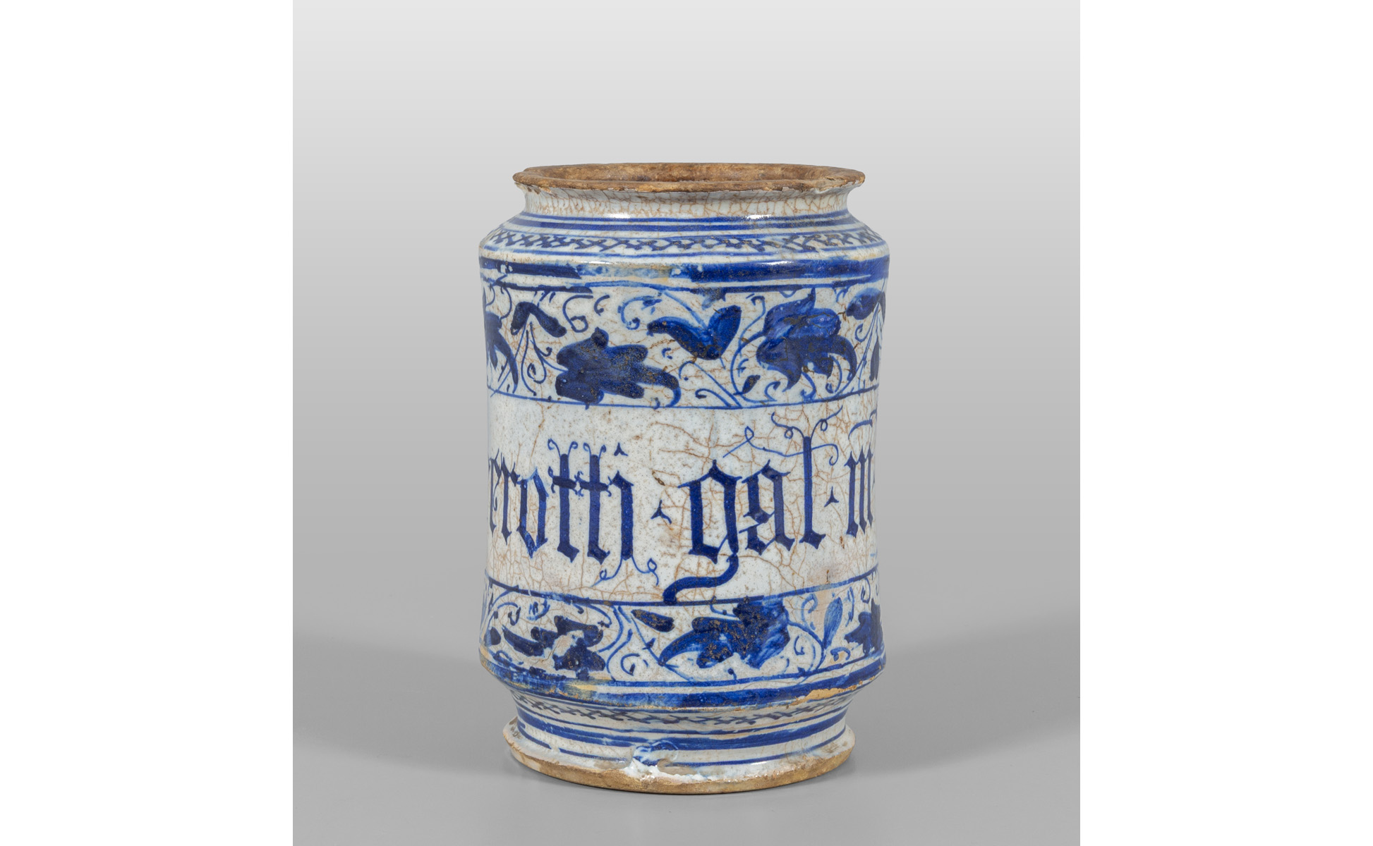 Albarello in maiolica a decoro vegetale con cartiglio e scritta in caratteri gotici, Faenza sec.XVI