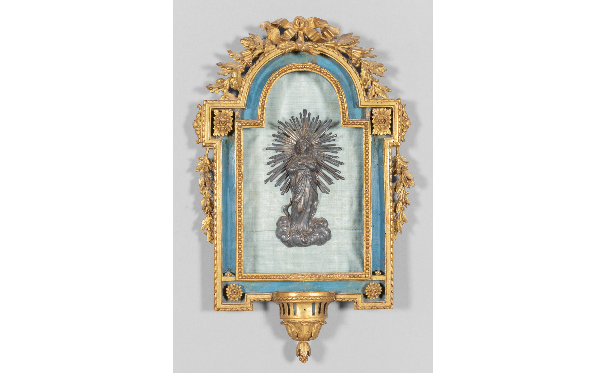 Acquasantiera Luigi XVI in legno intagliato e dorato con all'interno Madonnina in argento sbalzato, Genova sec.XVIII