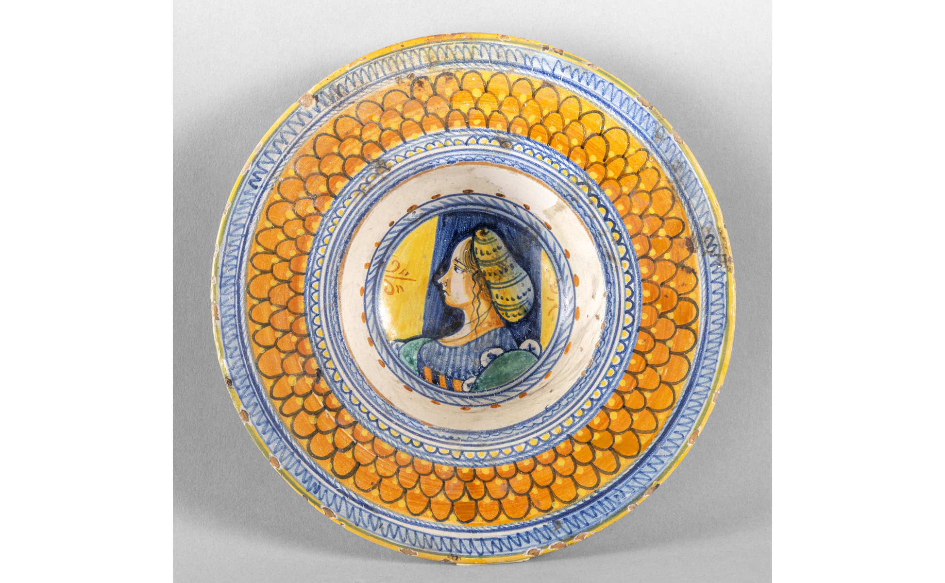 Piatto in maiolica policroma con tesa dipinta a palmette e figura di donna nel cavetto, Deruta sec.XVIII