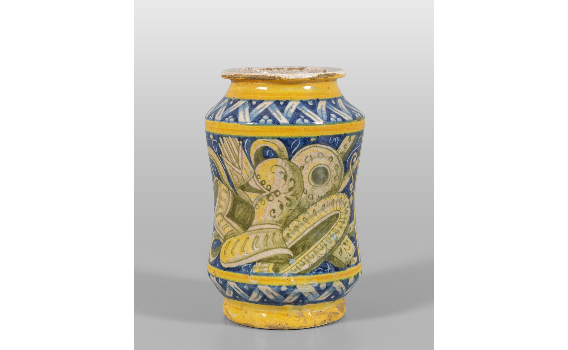Albarello in maiolica decorato a trofei e grottesche, Faenza sec.XVI