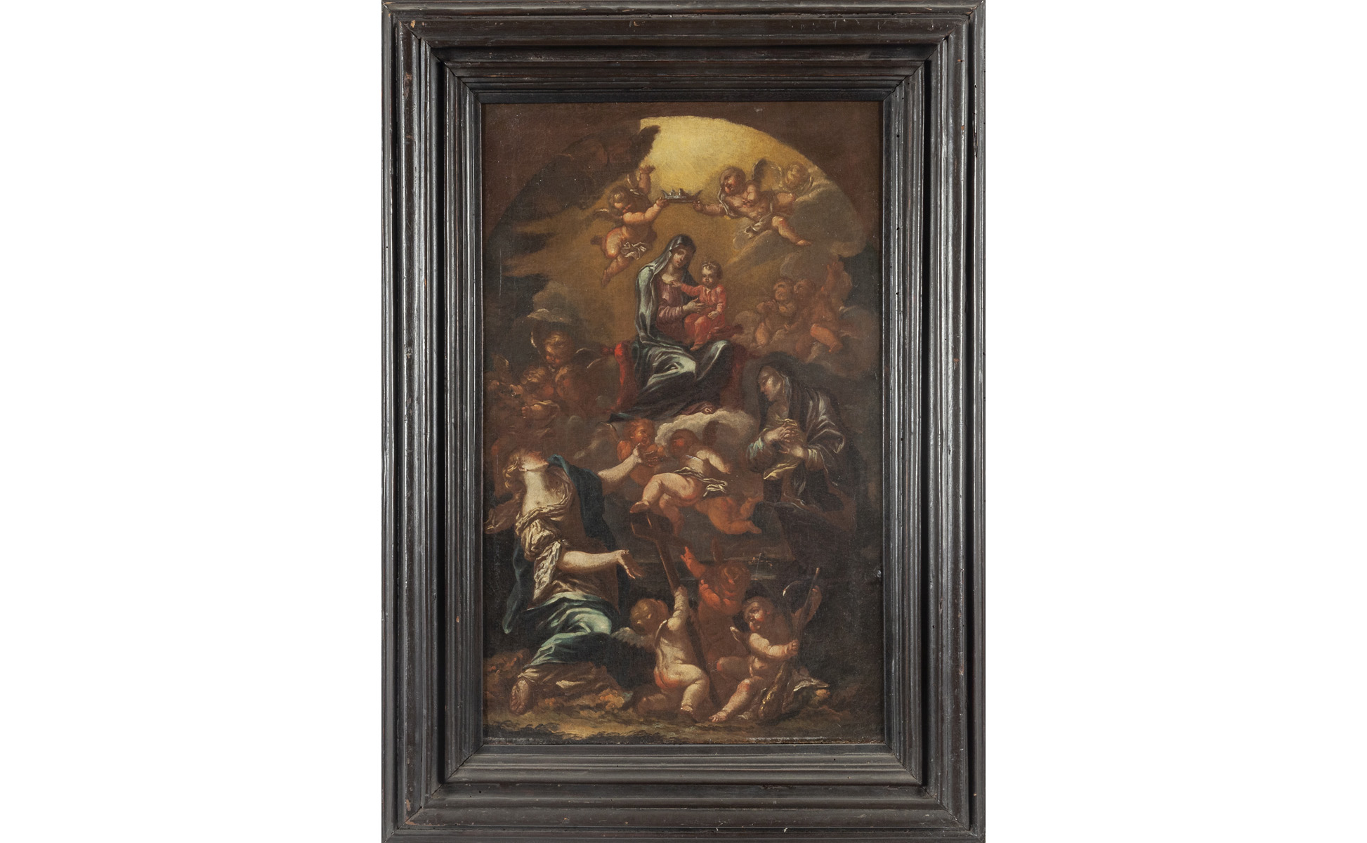Scuola napoletana sec.XVIII "L'Ascensione della Vergine" olio, bozzetto preparatorio per pala d'altare, cornice in legno ebanizzato