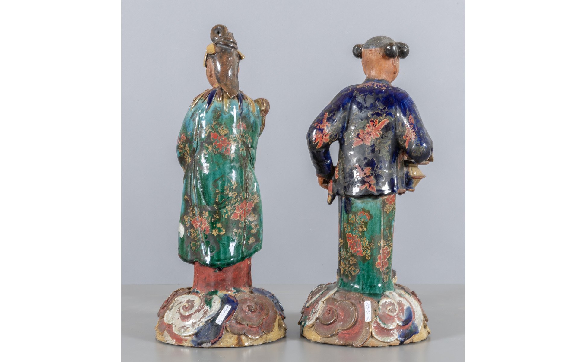 Coppia di dignitari in terracotta invetriata decorata in policromia, Cina sec.XVIII