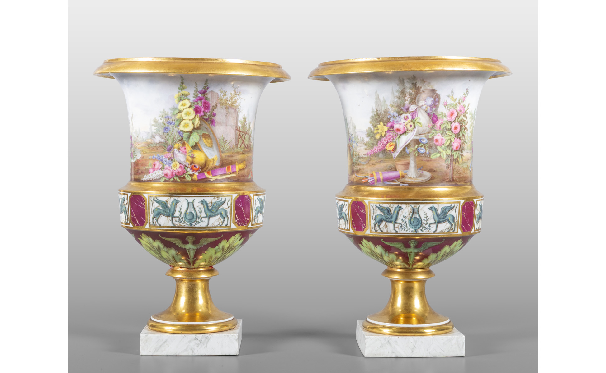 Coppia di vasi in porcellana policroma decorati con paesaggi floreali, Francia sec.XIX