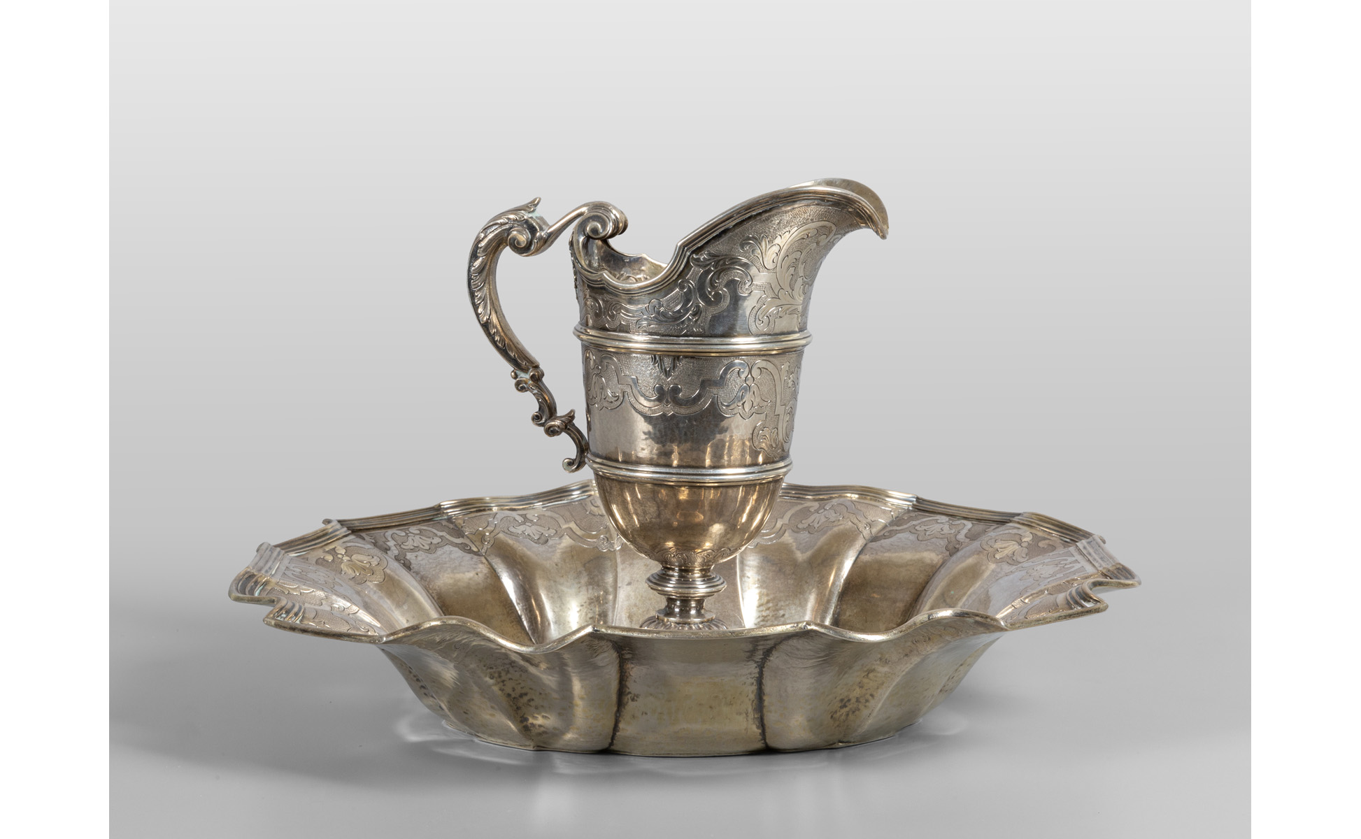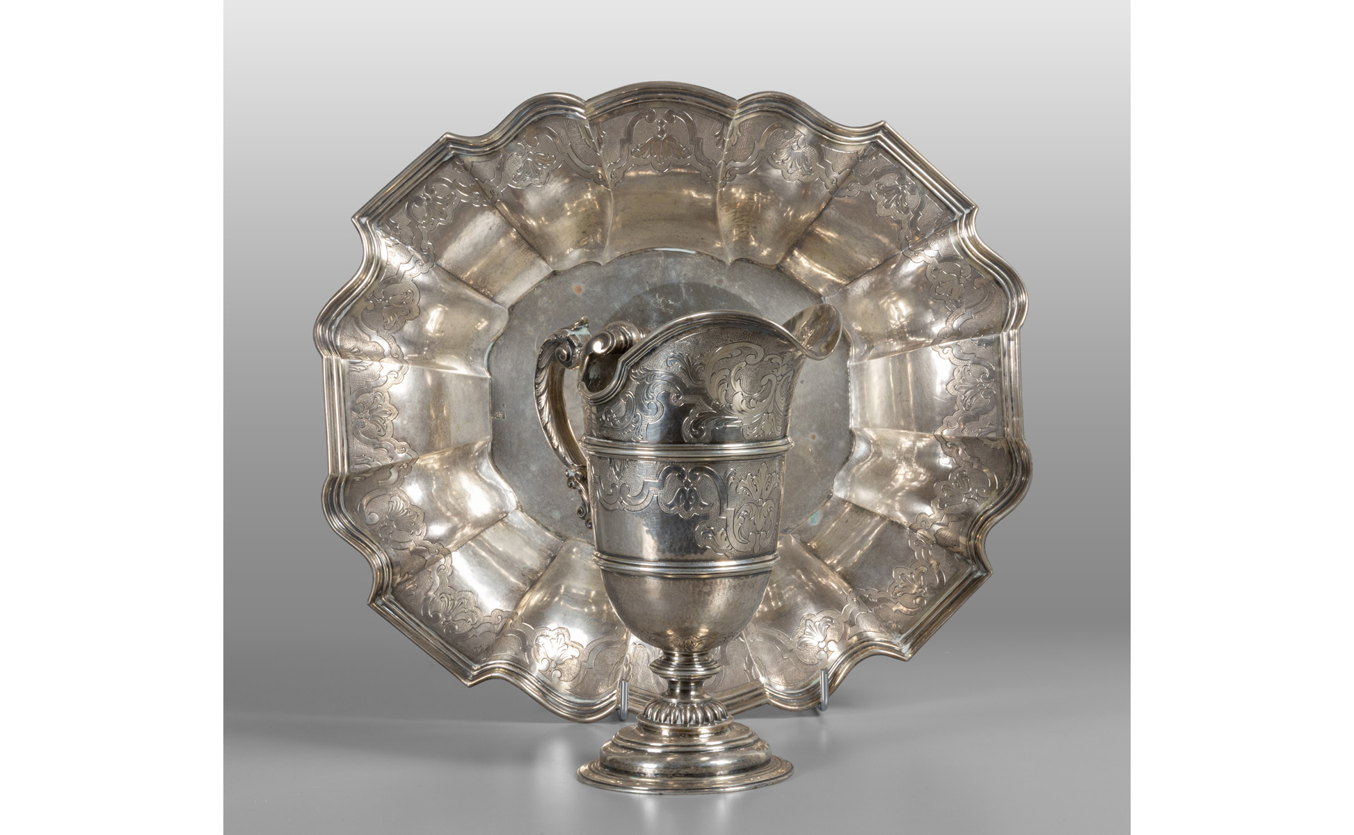 Acquamanile con vassoio in argento, ricca decorazione cesellata e sbalzata a motivi naturalistici, punzoni della città di Mosca, punzone 84 d.to 1778