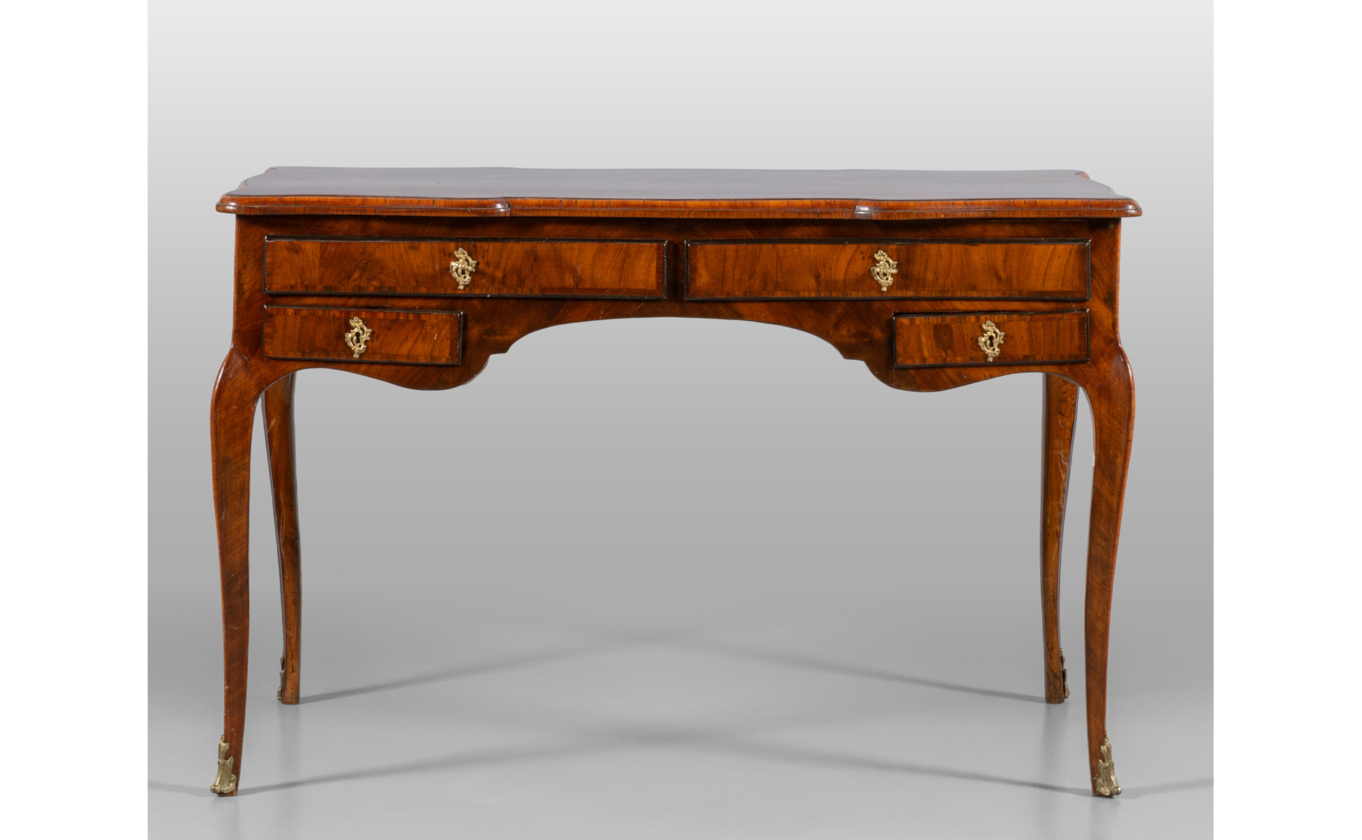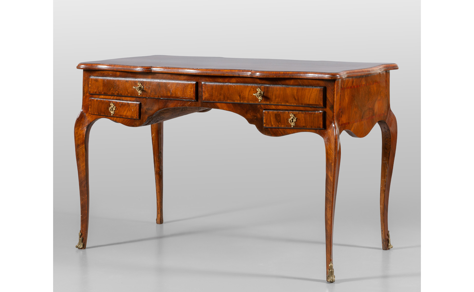 Scrivania Luigi XV a quattro cassetti lastronata in noce d'India, Piemonte sec.XVIII