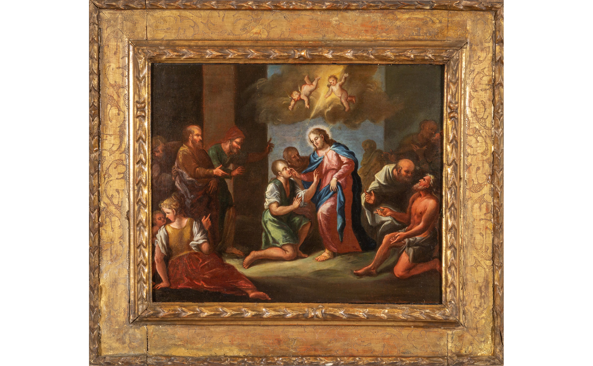 Scuola veneta sec.XVII "Gesù guarisce il cieco" olio su tavola, cornice in legno intagliato e dorato