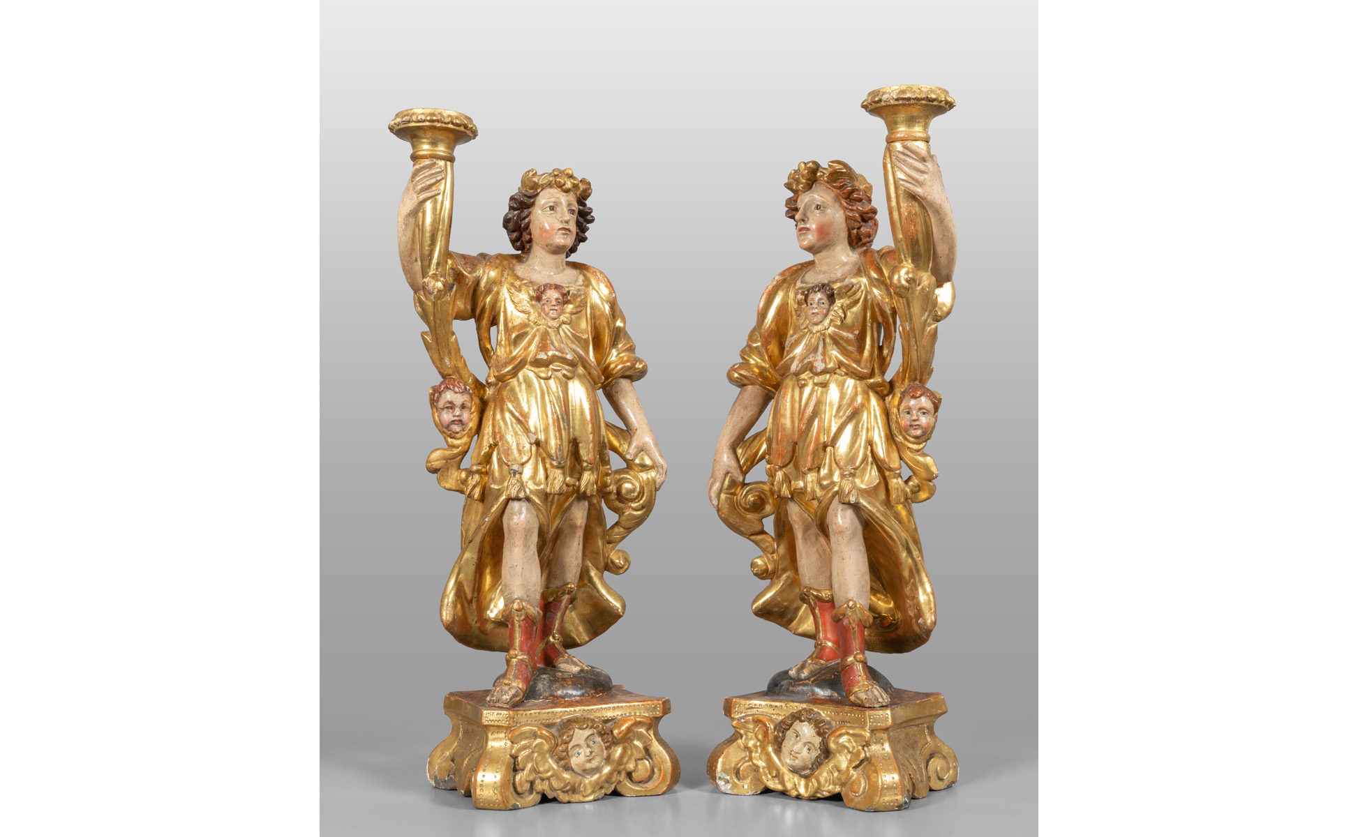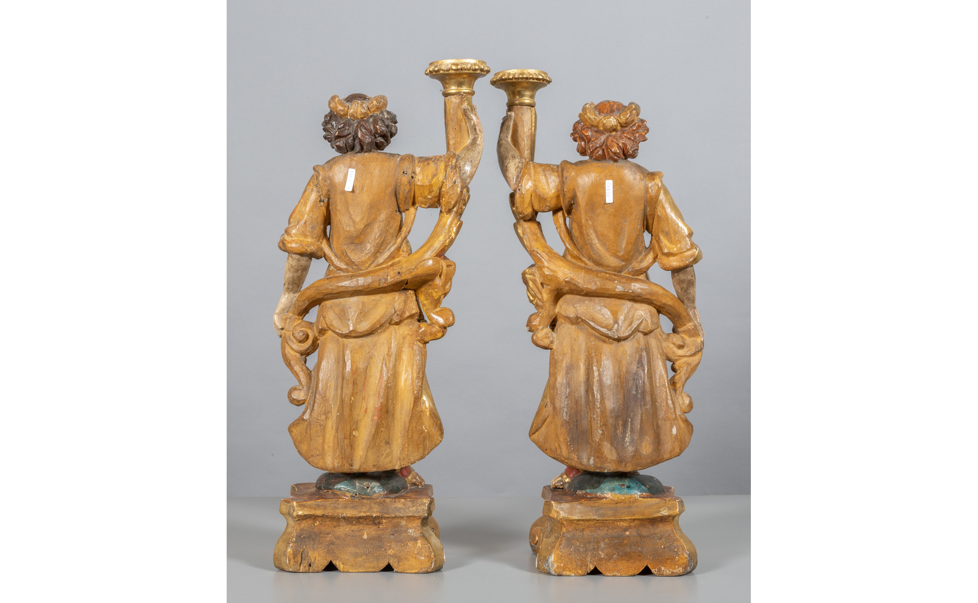 Coppia di cornucopie in legno finemente intagliato, dorato e laccato, sec.XVIII