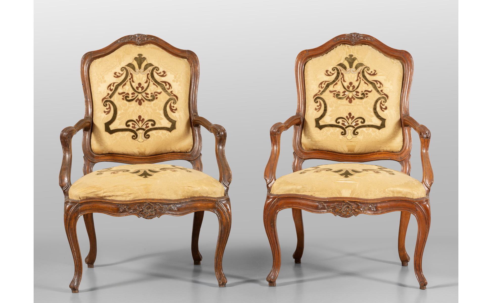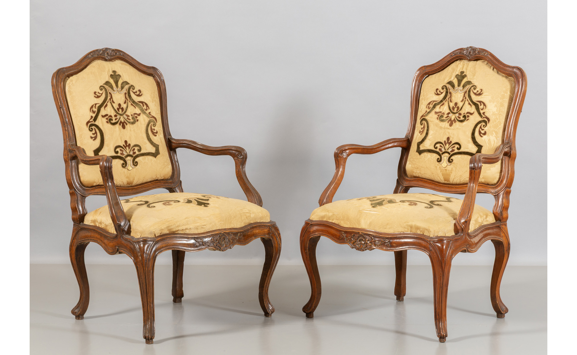 Coppia di poltrone Luigi XV in noce finemente intagliato, Genova metà sec.XVIII