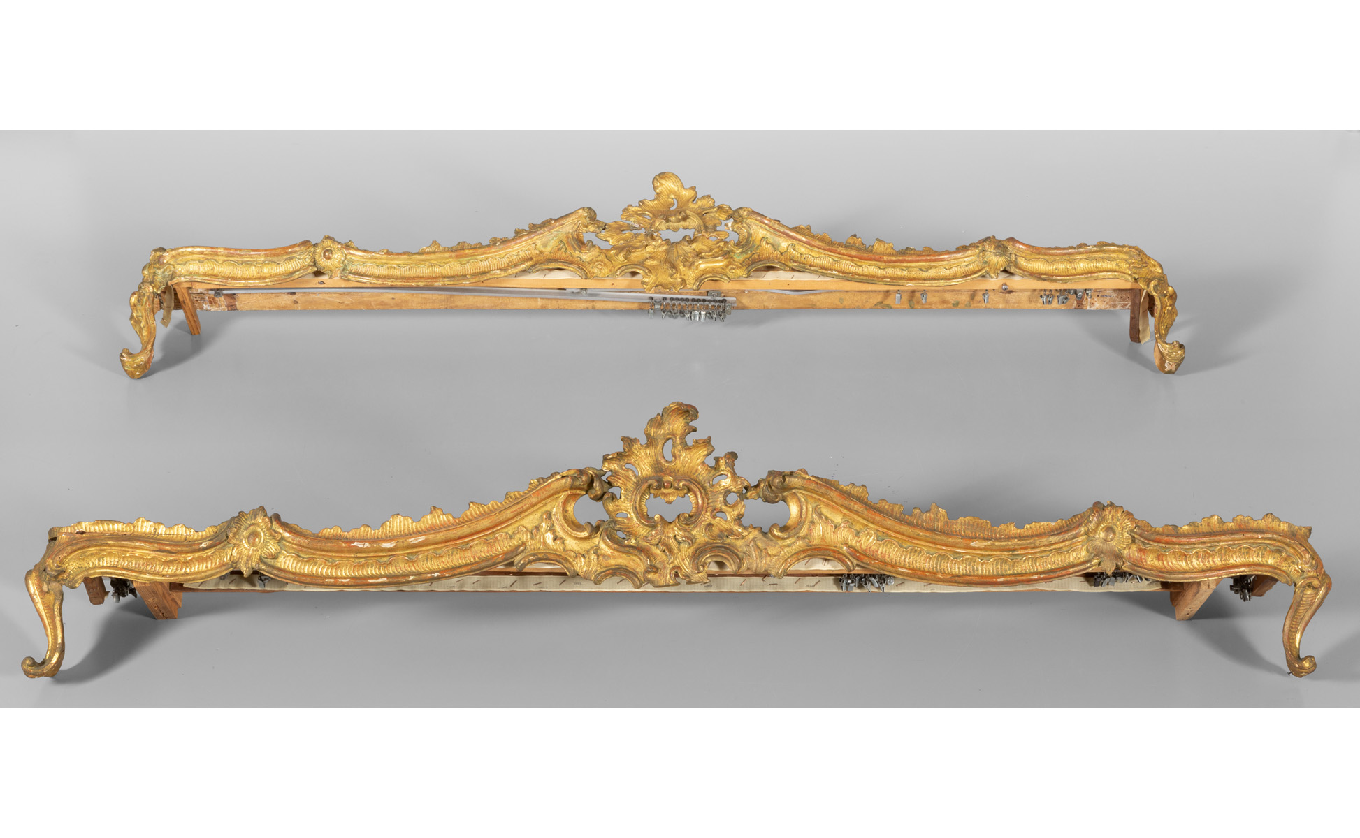 Coppia di mantovane Luigi XV in legno finemente intagliato e dorato, Genova metà sec.XVIII