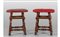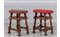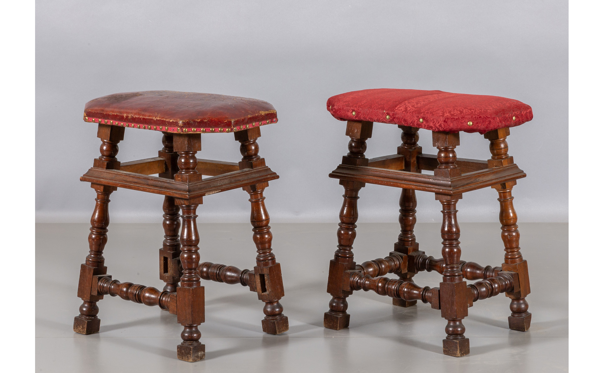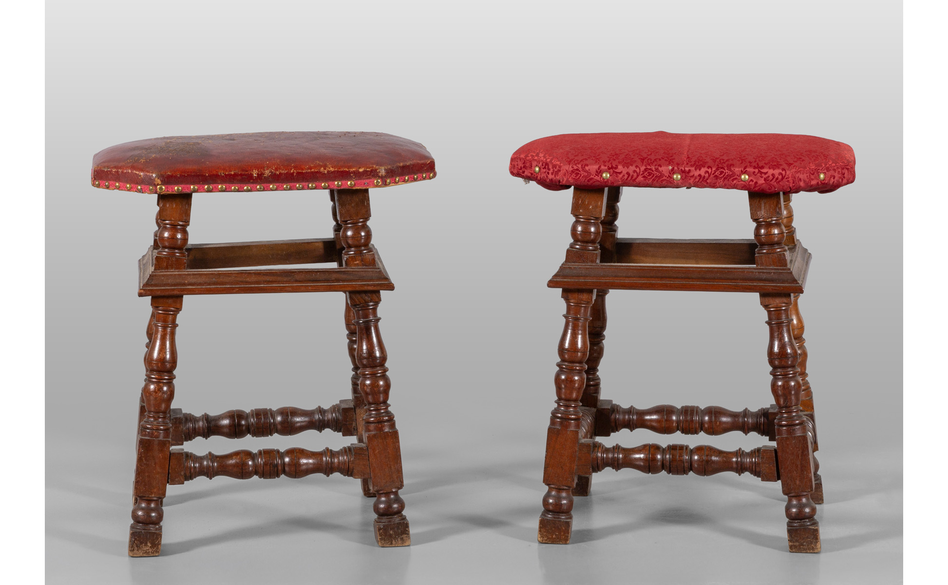 Coppia di sgabelli a rocchetto in noce ricoperti in damasco rosso, sec. XVIII