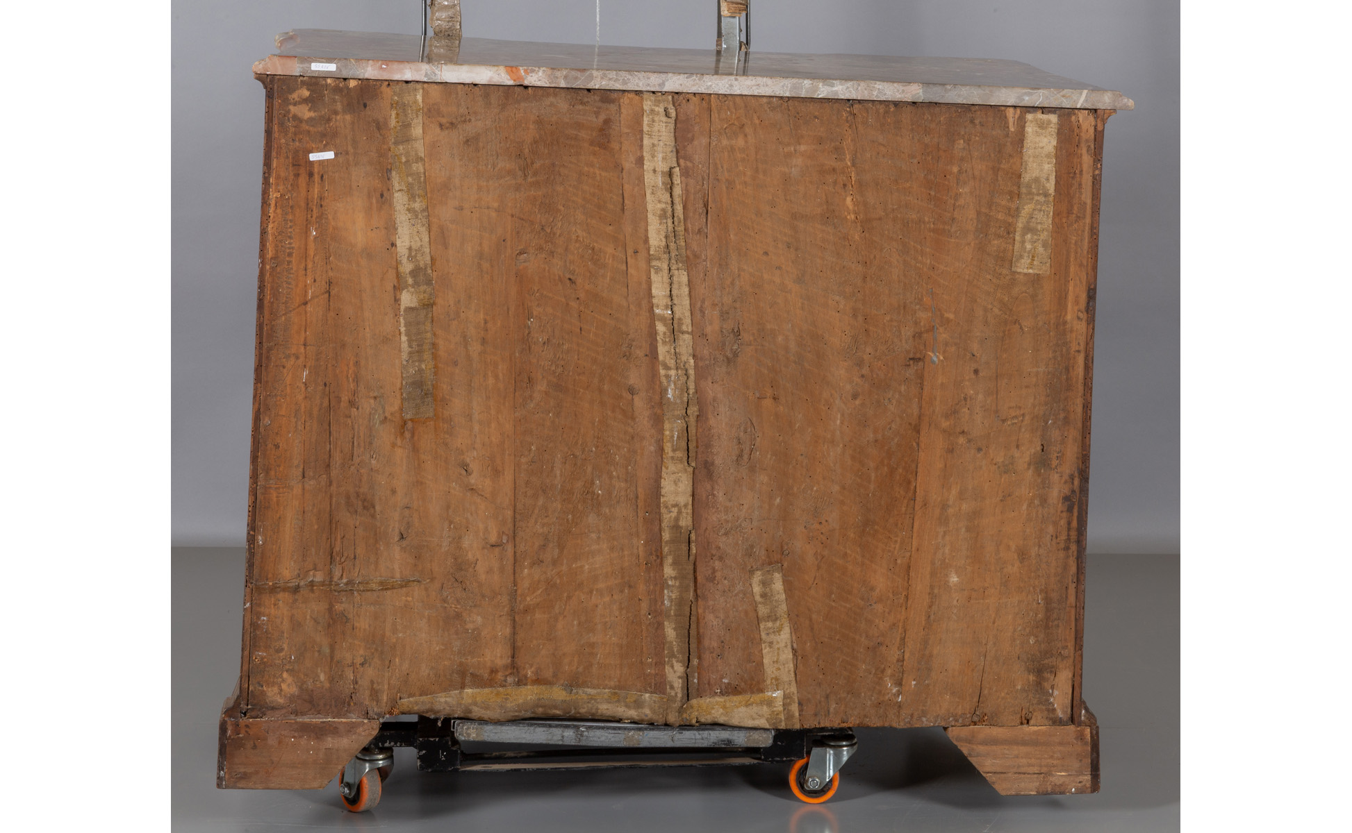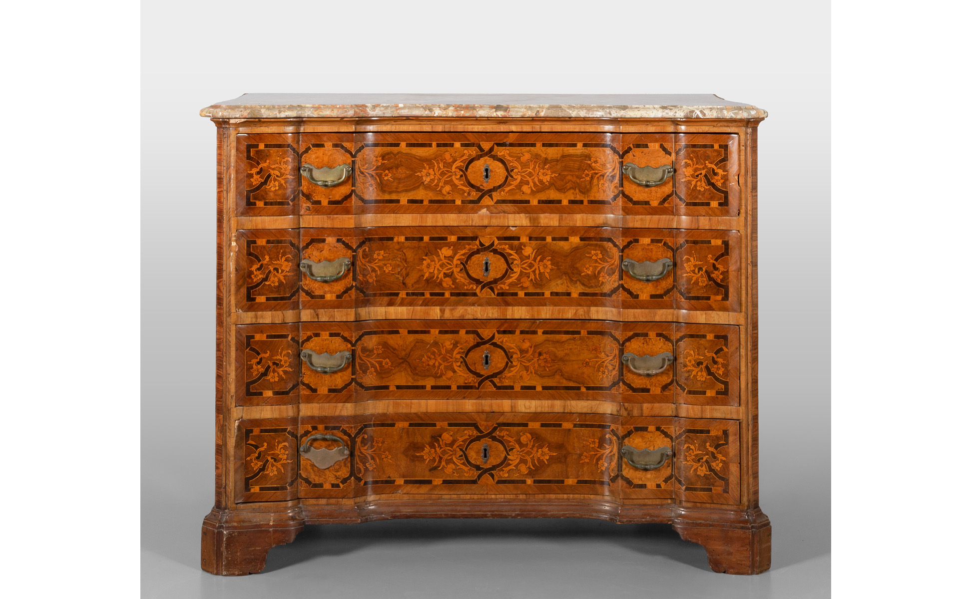 Comò Luigi XIV a doppia mossa, fianchi scantonati, quattro cassetti, lastronato in radica e finemente intarsiato a motivi floreali, piano in breccia, Alto Veneto I metà sec. XVIII
