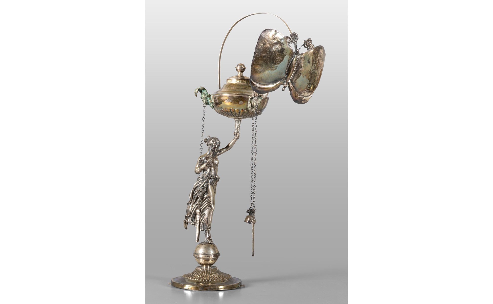 Lampada in argento sbalzato raffigurante figura neoclassica con portaluce a forma di farfalla, argentiere Angelo Giannotti (Maestro dal 1830 al 1860), Roma sec.XIX