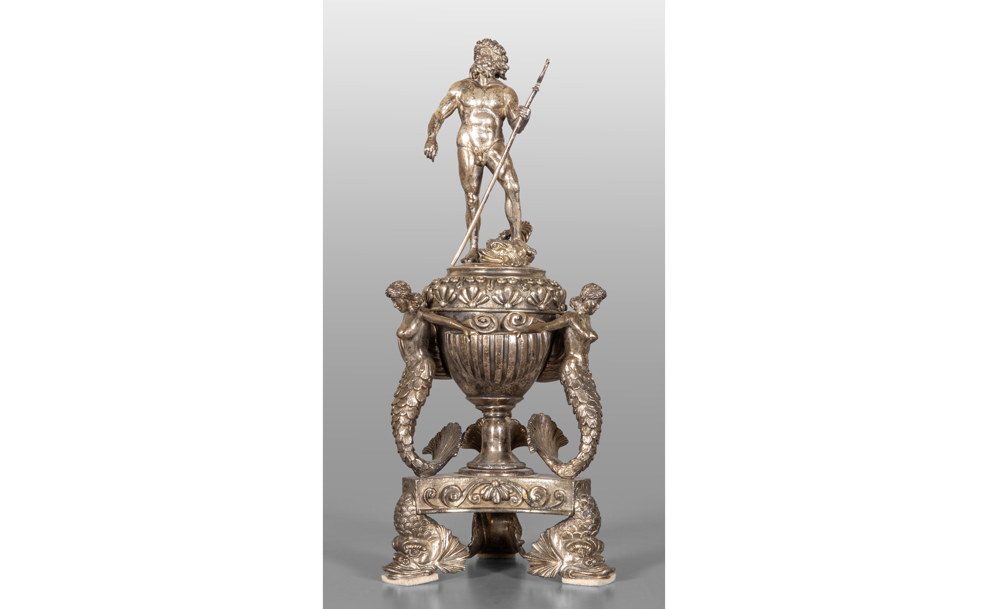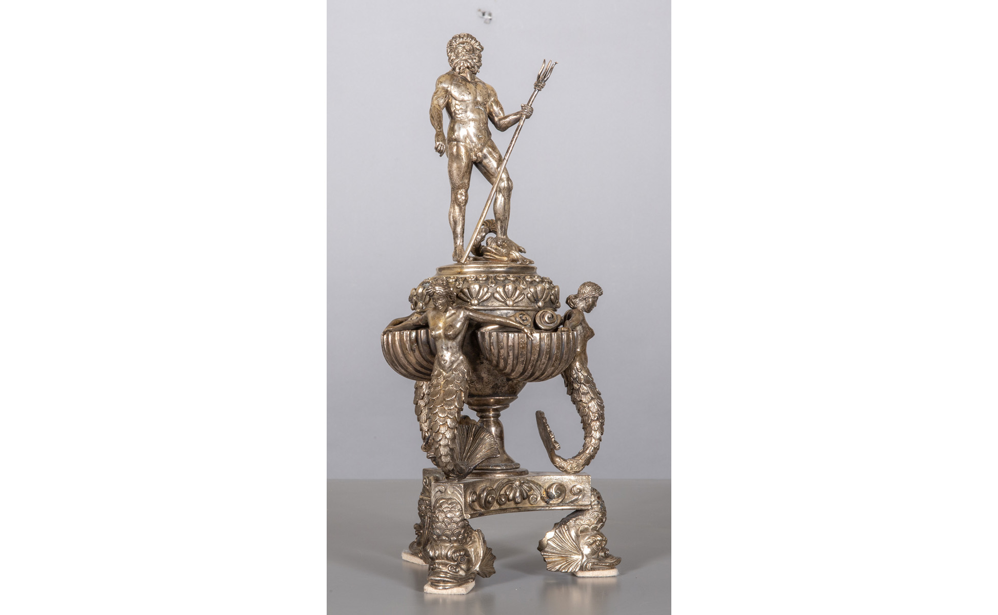 Grande saliera raffigurante Nettuno sorretto da sirene in argento finemente sbalzato, argentiere Filippo Grimaldi (Maestro argentiere dal 1803 al 1848), Roma sec.XIX