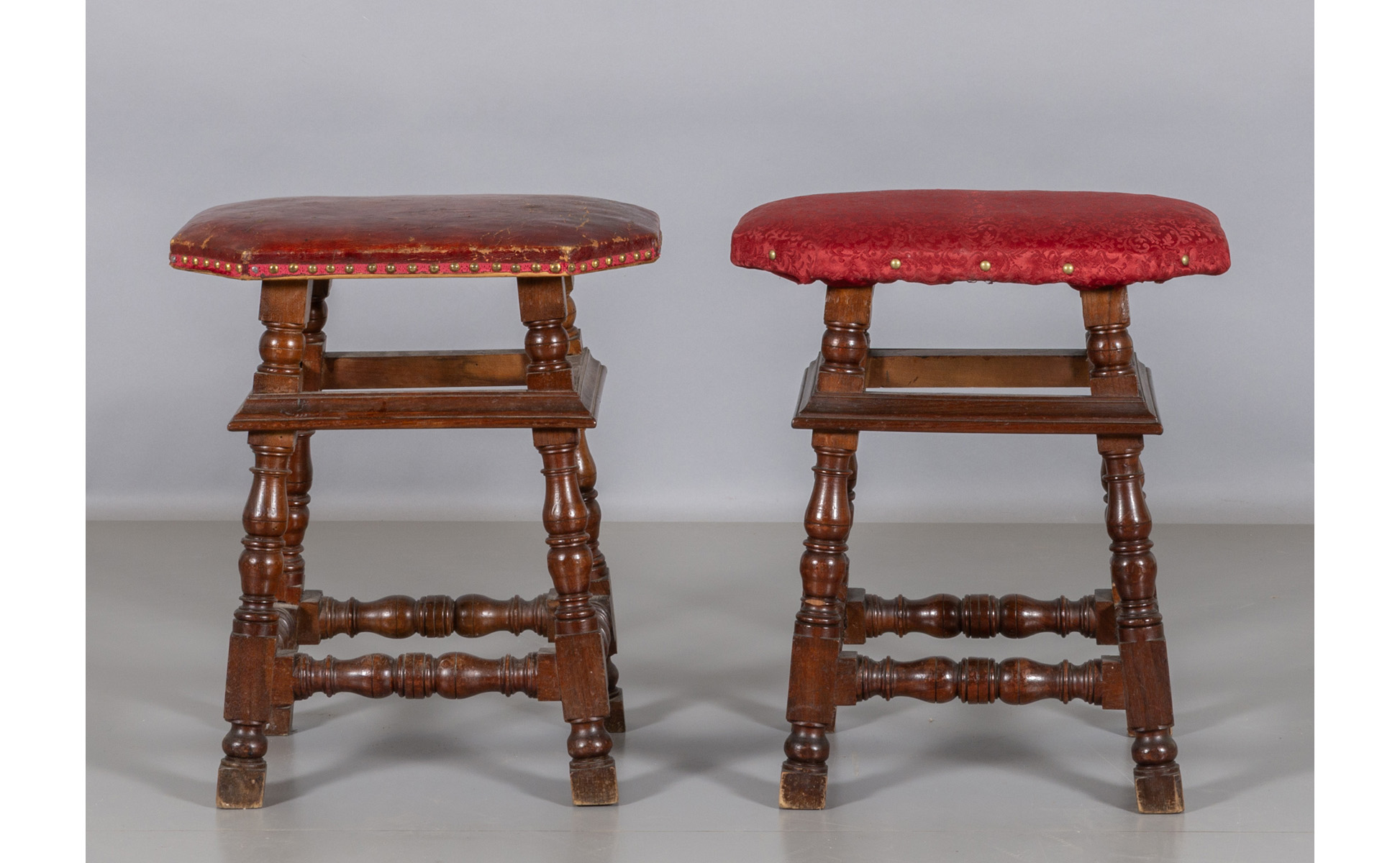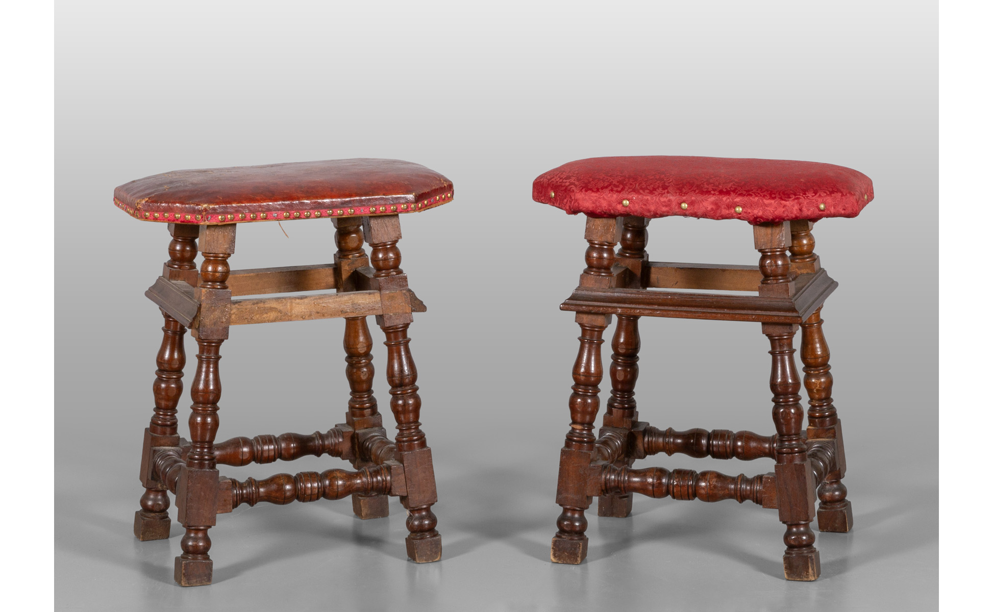 Coppia di sgabelli a rocchetto in noce ricoperti con cuoio di epoca, sec. XVIII