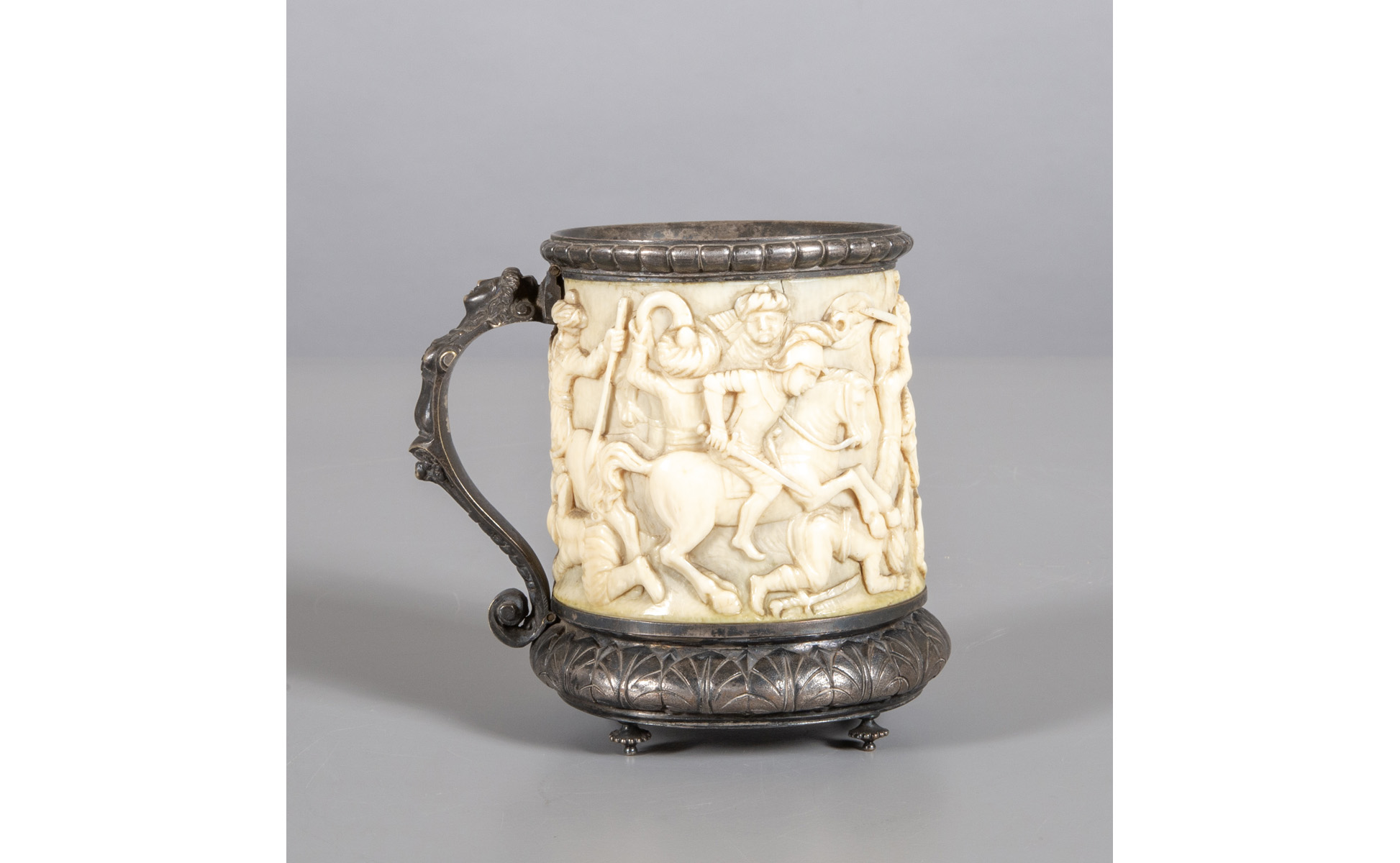 Boccale in avorio scolpito con applicazioni in argento, raffigurante scontro di cavalieri, inizi sec.XIX