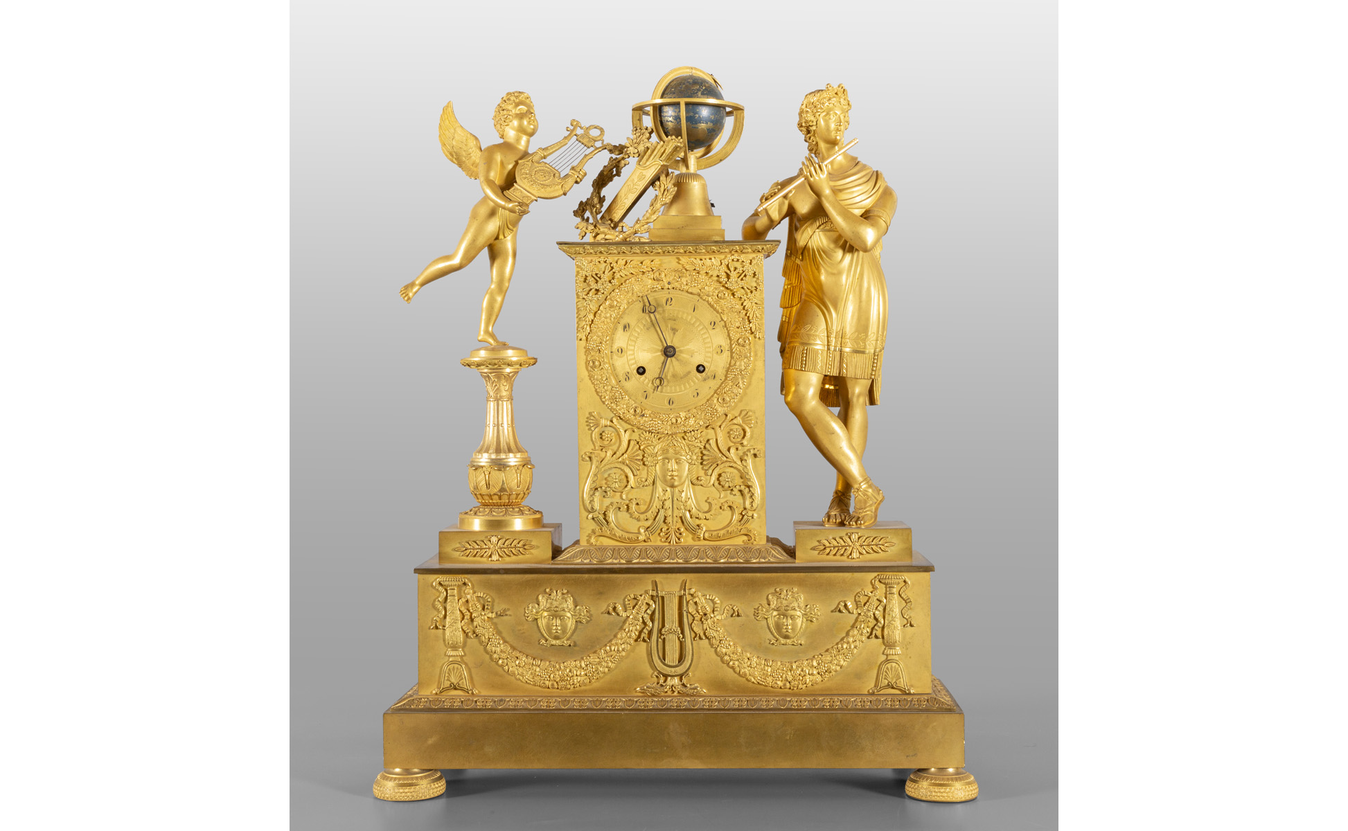 Grande orologio Impero in bronzo dorato raffigurante allegoria della musica, Francia inizi sec.XIX