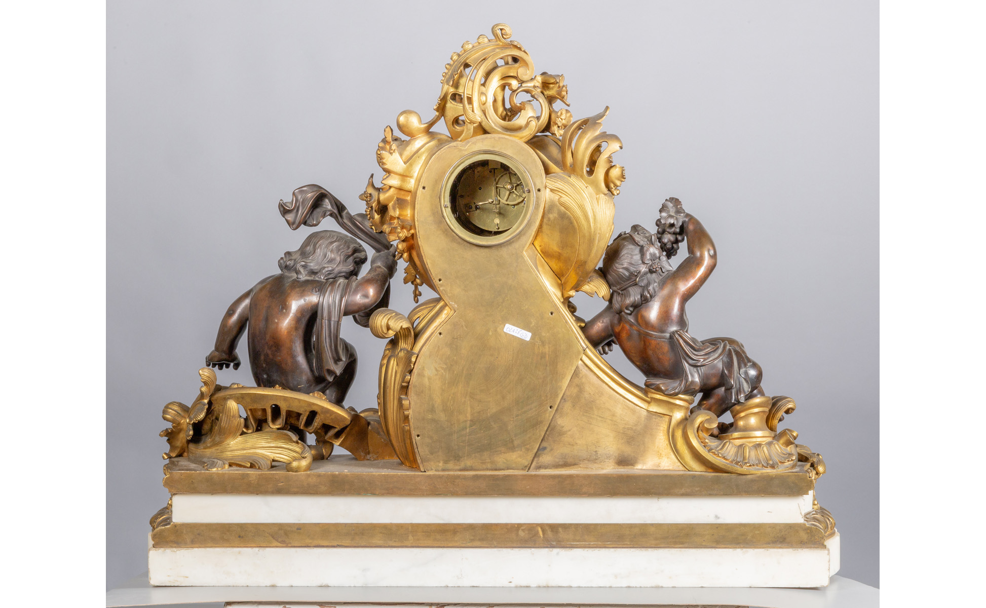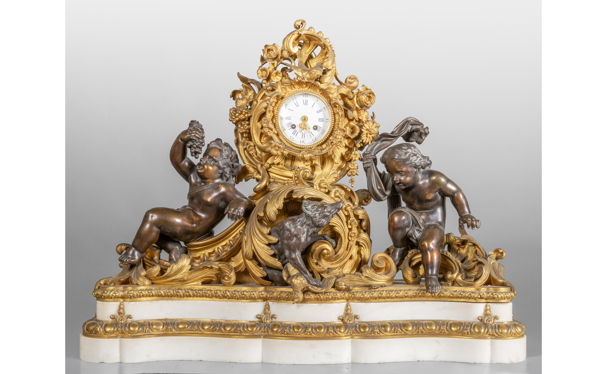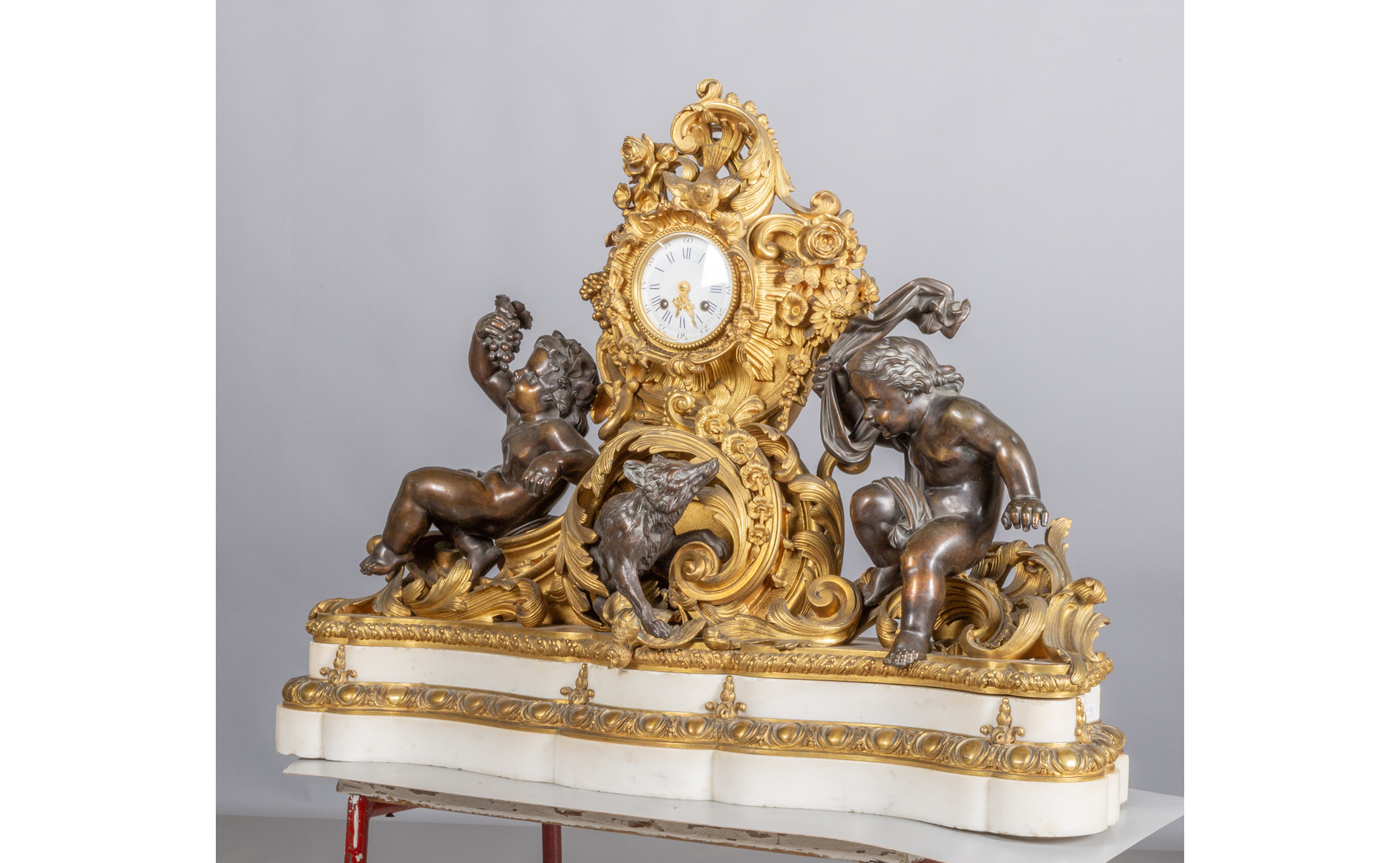 Monumentale orologio Napoleone III in bronzo dorato e marmo raffigurante Romolo e Remo con uva e la lupa, Francia sec.XIX