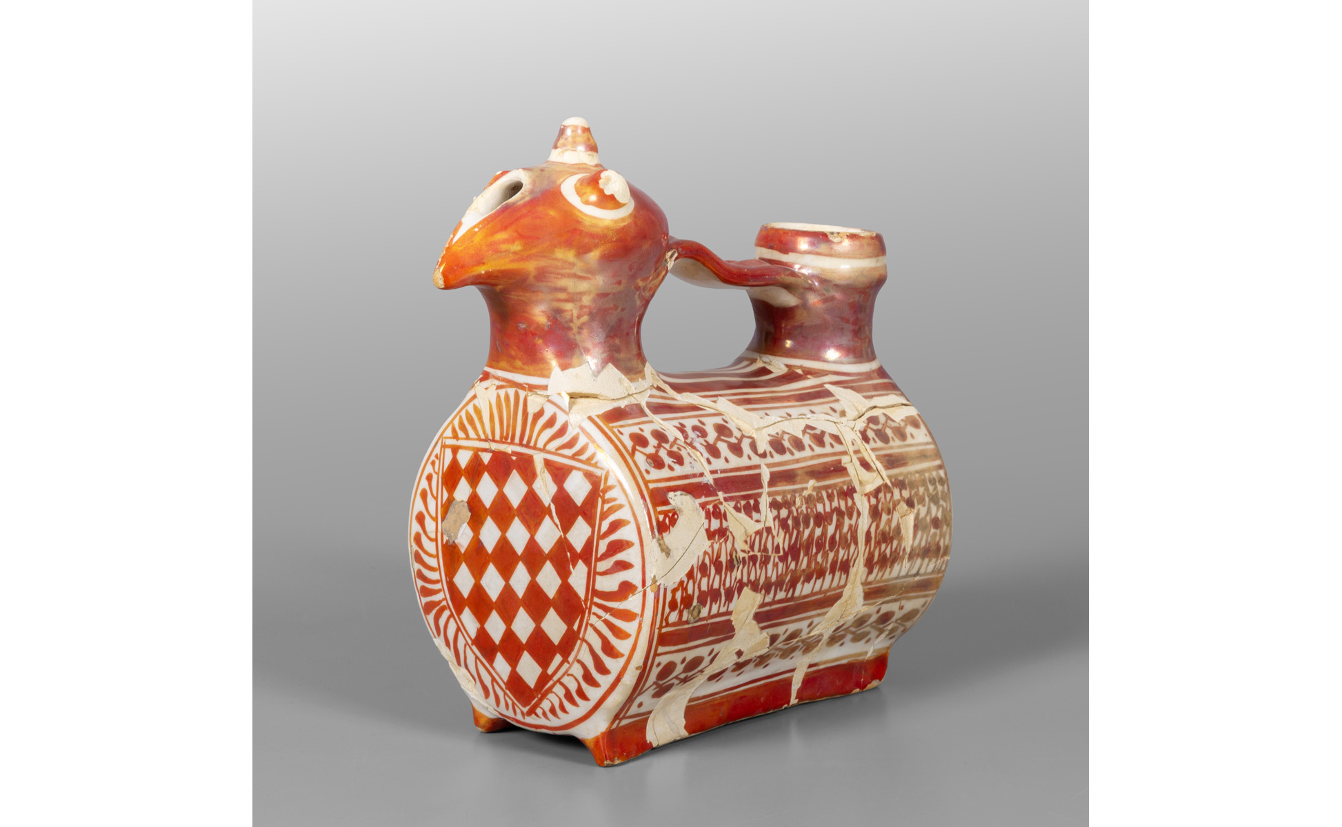 Acquamanile in maiolica a lustro, raffigurante