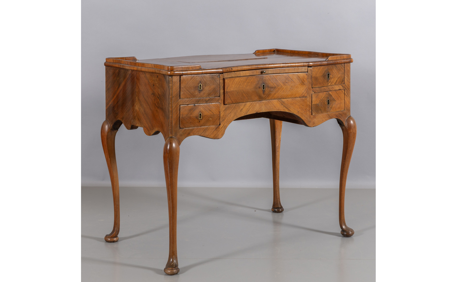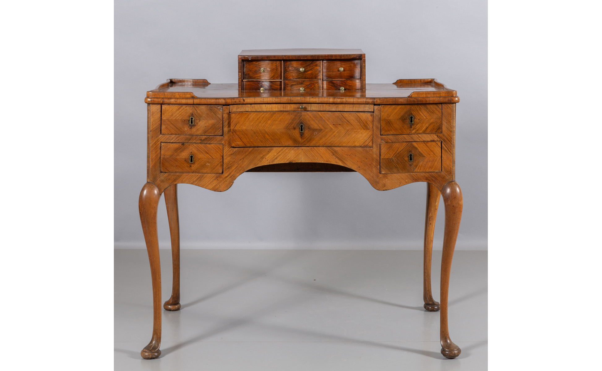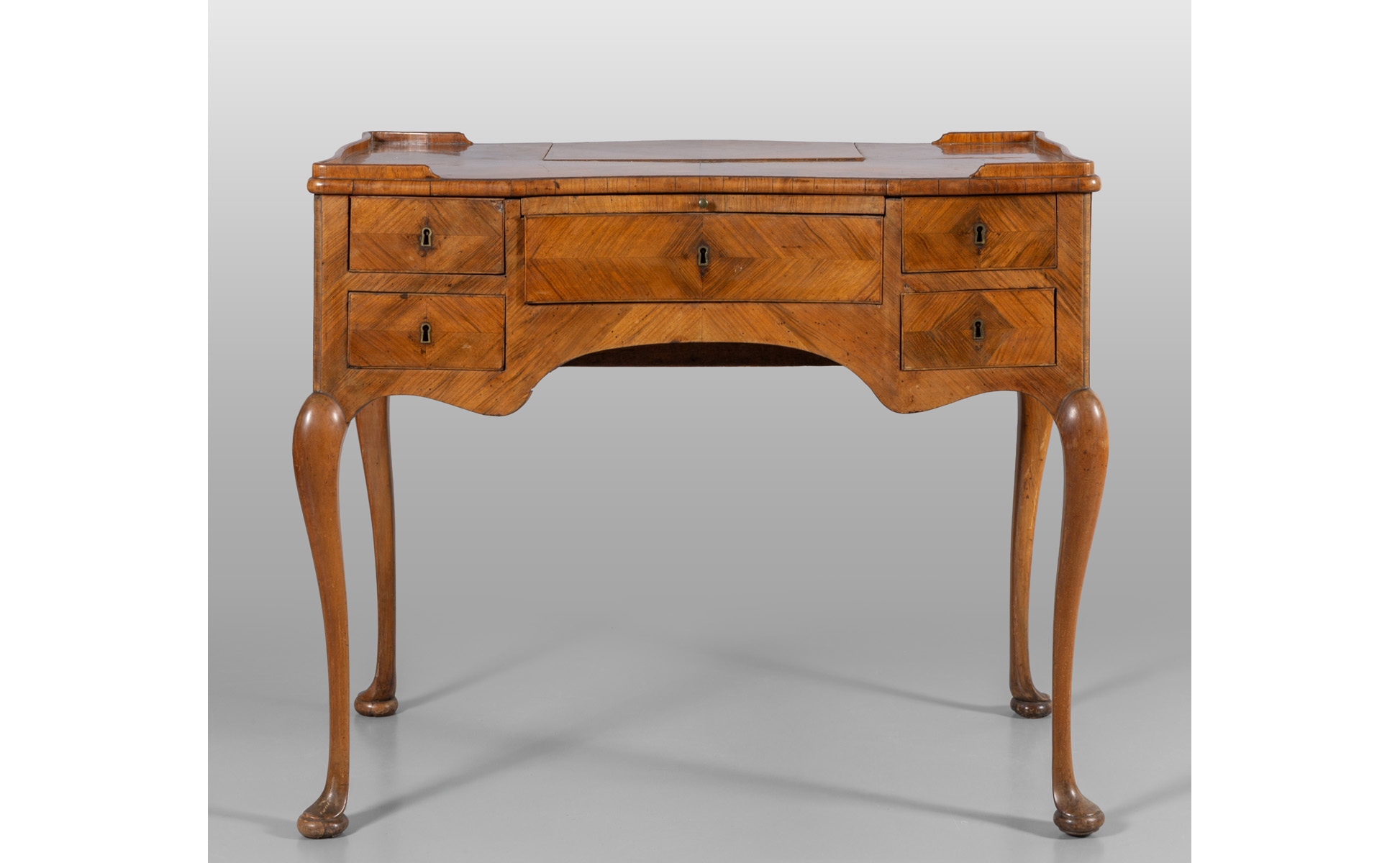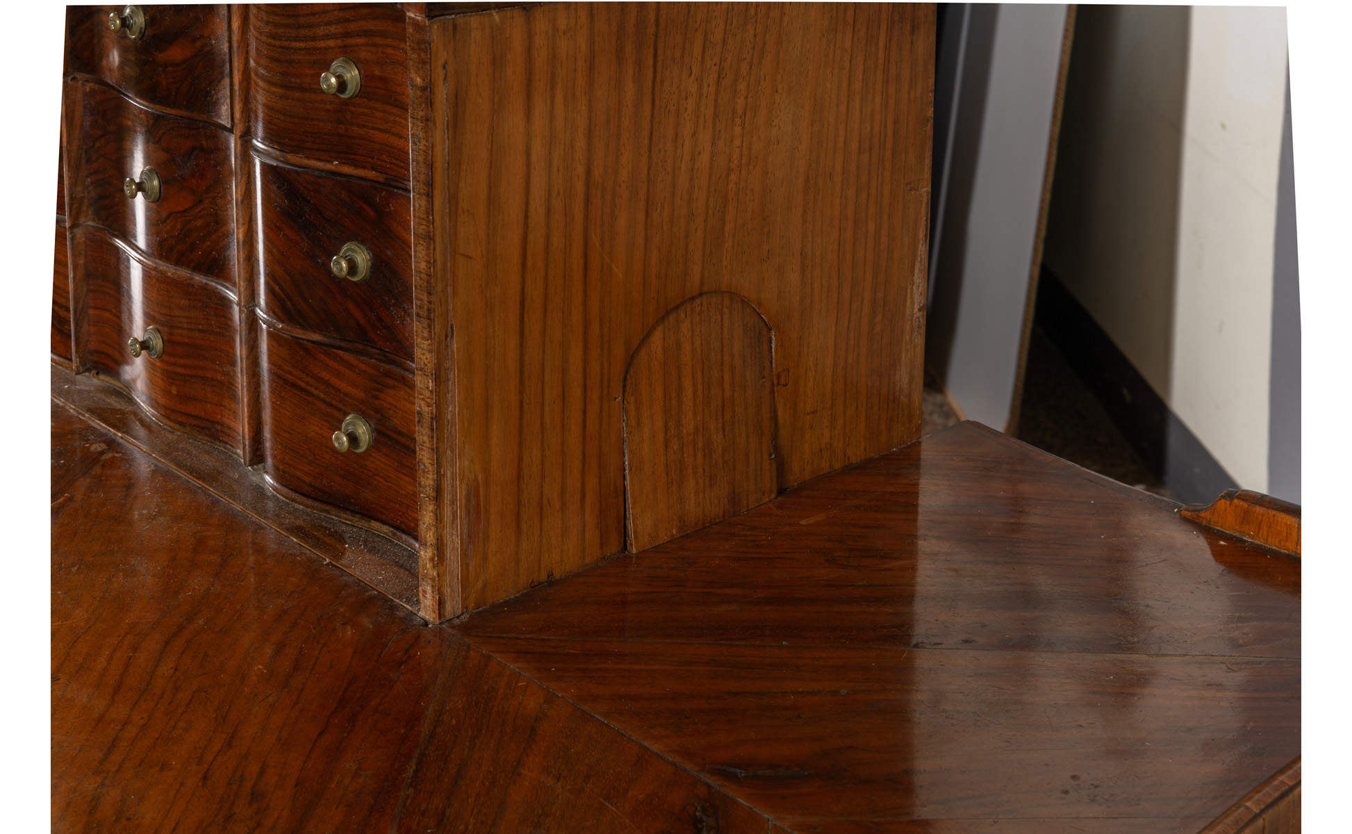 Raro scrittoio da cambista Luigi XIV movimentato sul fronte e sui fianchi, lastronato in palissandro e legni vari, sul fronte cinque cassetti con segreti e pianetto scrittoio, parte centrale del piano rialzabile che cela cassettini, Italia Meridionale I metà sec.XVIII