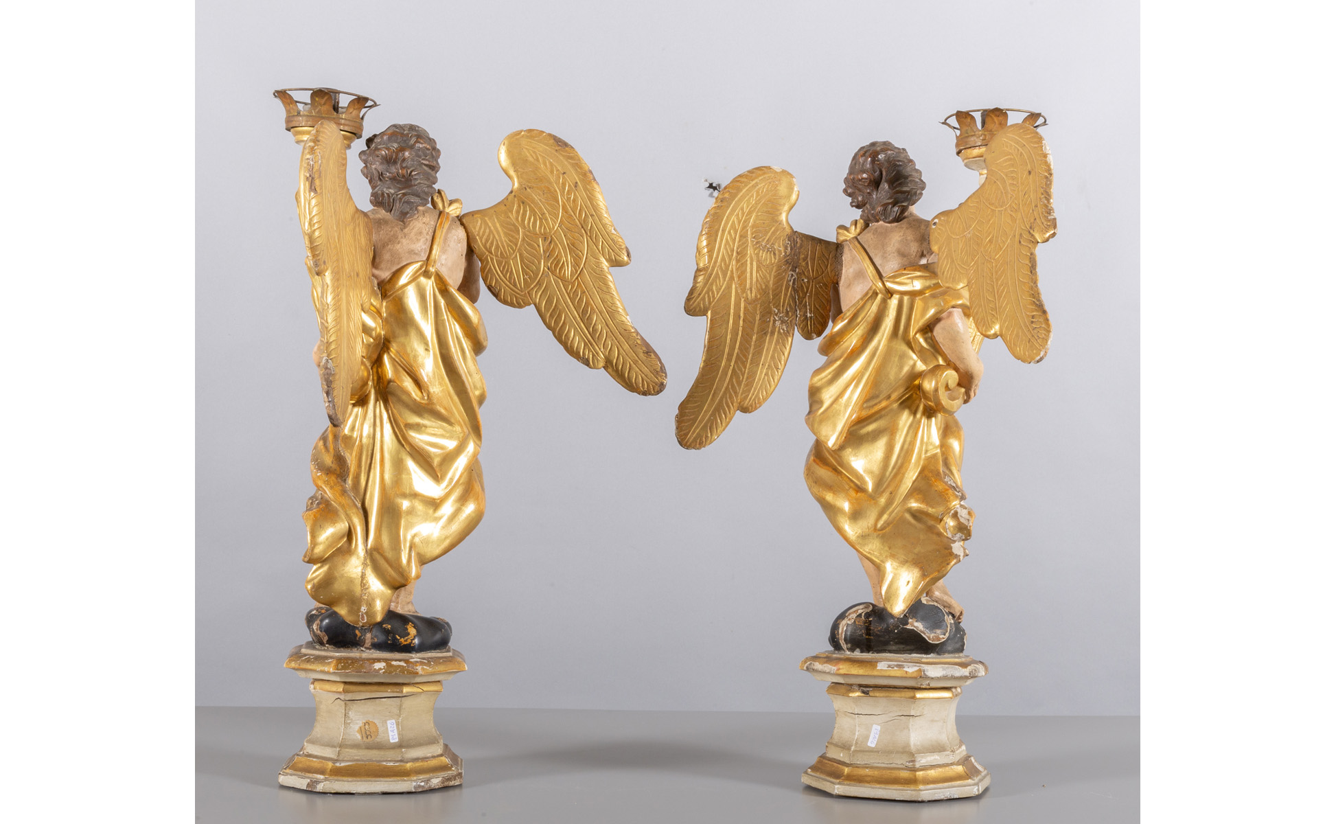 Coppia di angeli portacero in legno intagliato e dorato, Italia Centrale, inizi sec.XVIII