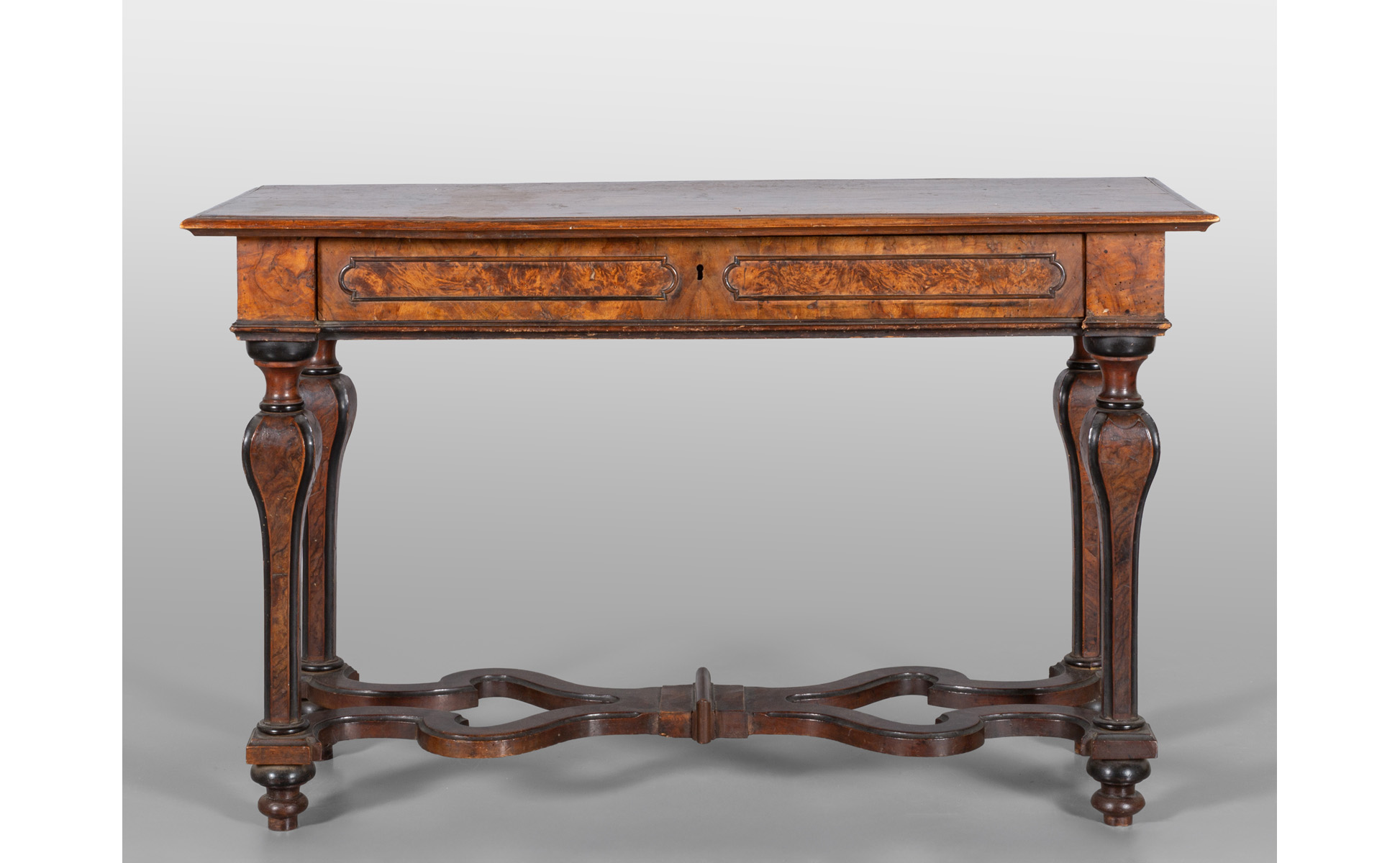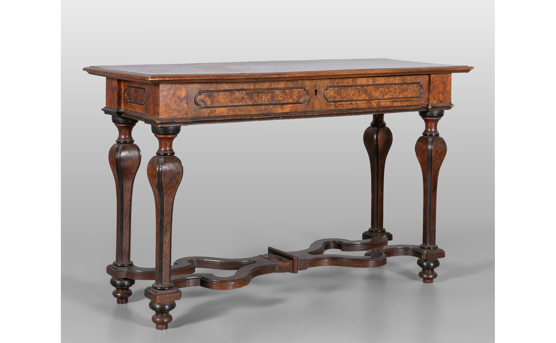 Tavolo da centro Luigi XIV lastronato in radica di tuja, cassetto nella fascia, Lombardia sec.XVIII