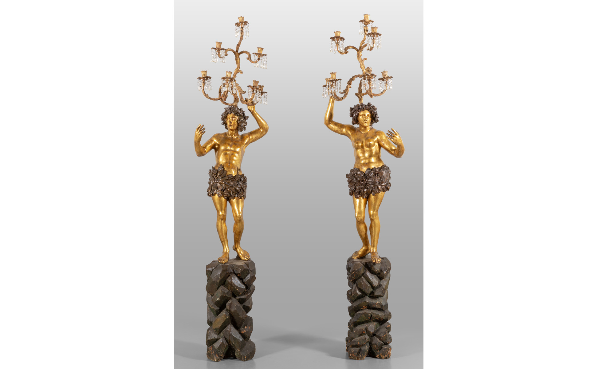 Coppia di sculture in legno intagliato e dorato su base a forma di roccia con bracci a cinque luci, Genova sec.XVIII