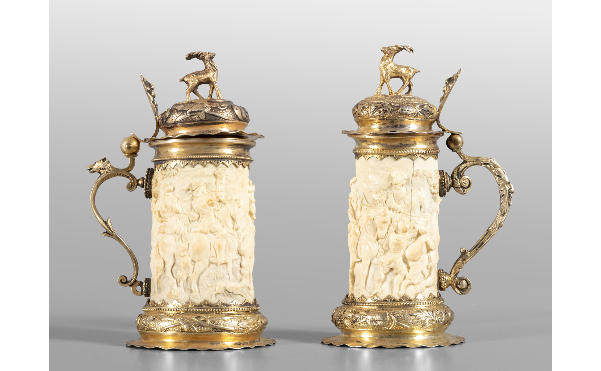 Coppia di piccoli tankard in avorio con applicazioni in argento dorato, sec.XIX